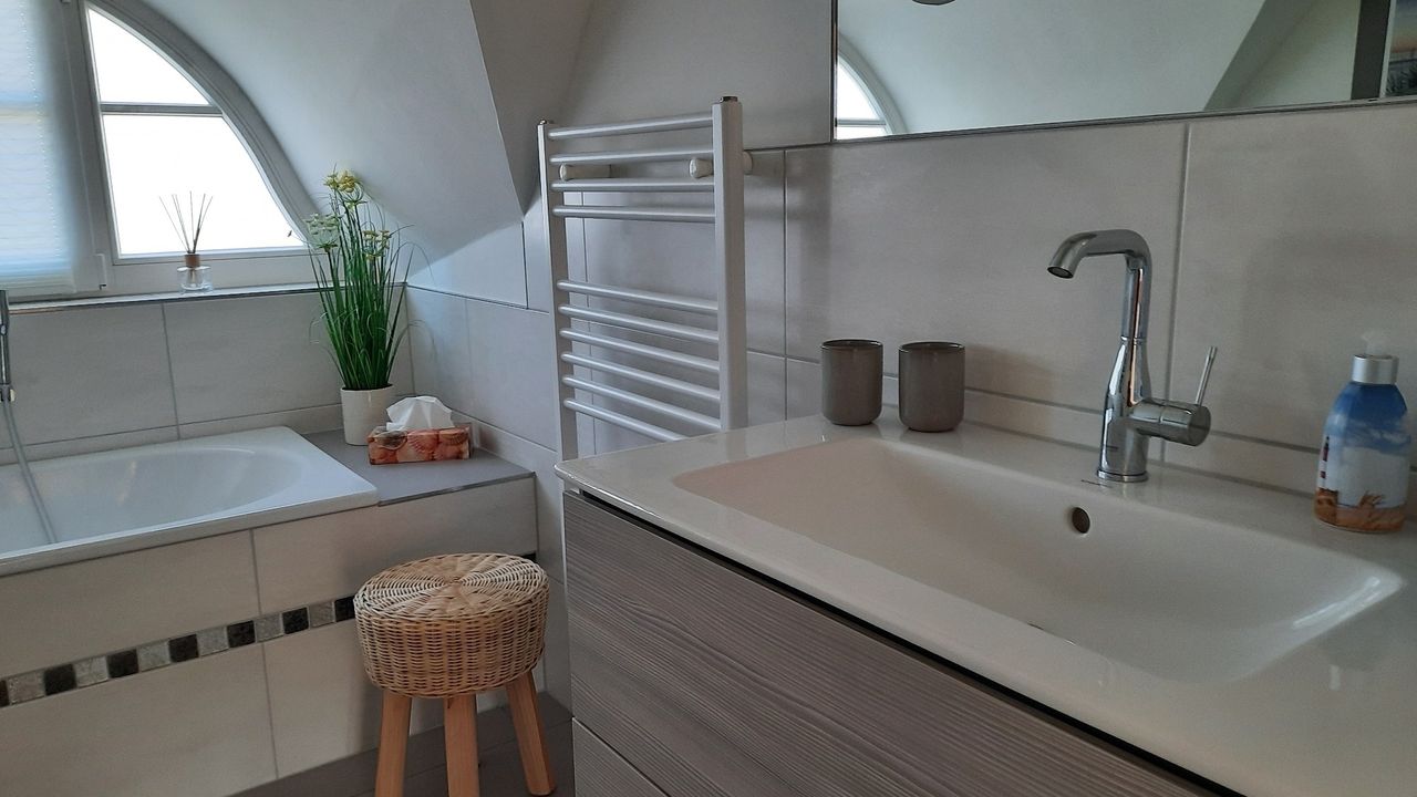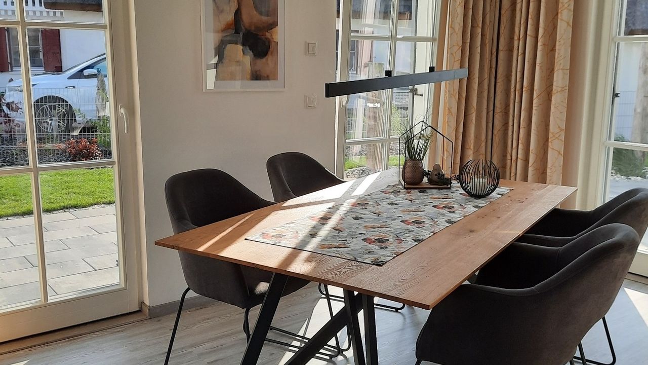 Wunderschönes Ferienhaus für max. 4 Personen mit Wellnessbereich (Sauna), Kaminofen, Balkon, Garten, Grill, Strandkorb, abschliessbarer GartenschuppenWunderschönes Reetdach-Ferienhaus in einer liebevoll gestalteten Ferienhaussiedlung mit Sauna, Kaminofen, Balkon mit Sitzmöbel, Holzkohlegrill, schöner Garten mit Terrasse, Strandkorb und Gartenmöbeln, 2 Schlafzimmer, max. 4 Personen, schöner Wohn- Essbereich, 2 Bäder, Fußbodenheizung, gehobene Ausstattung mit moderner, geschmackvoller Einrichtung, HiFi-System, W-Lan, Waschtrockner, PKW-Stellplätze am Haus