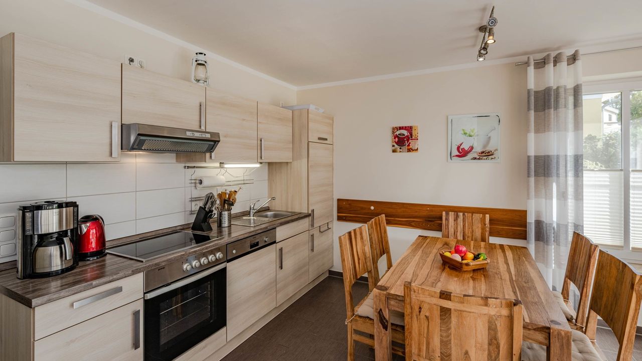 Eine helle, offene Einbauküche grenzt an das gemütliche Wohnzimmer. Vom Wohnzimmer hat man direkten Zugang zur Sonnenterasse mit Grillmöglichkeit.