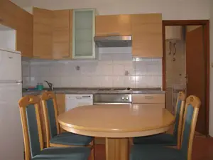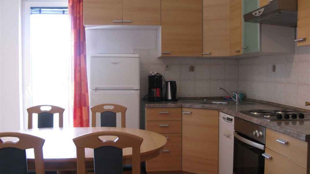. Wohnküche (14 qm) mit TV, Essecke und Zugang zum Balkon (8 qm, Gartenmöbel). 2 Schlafzimmer jeweils (12 qm) mit 1 Doppelbett. Kochecke in der Wohnküche. Bad (6 qm) mit Dusche, 1 Waschbecken, WC und Fenster.