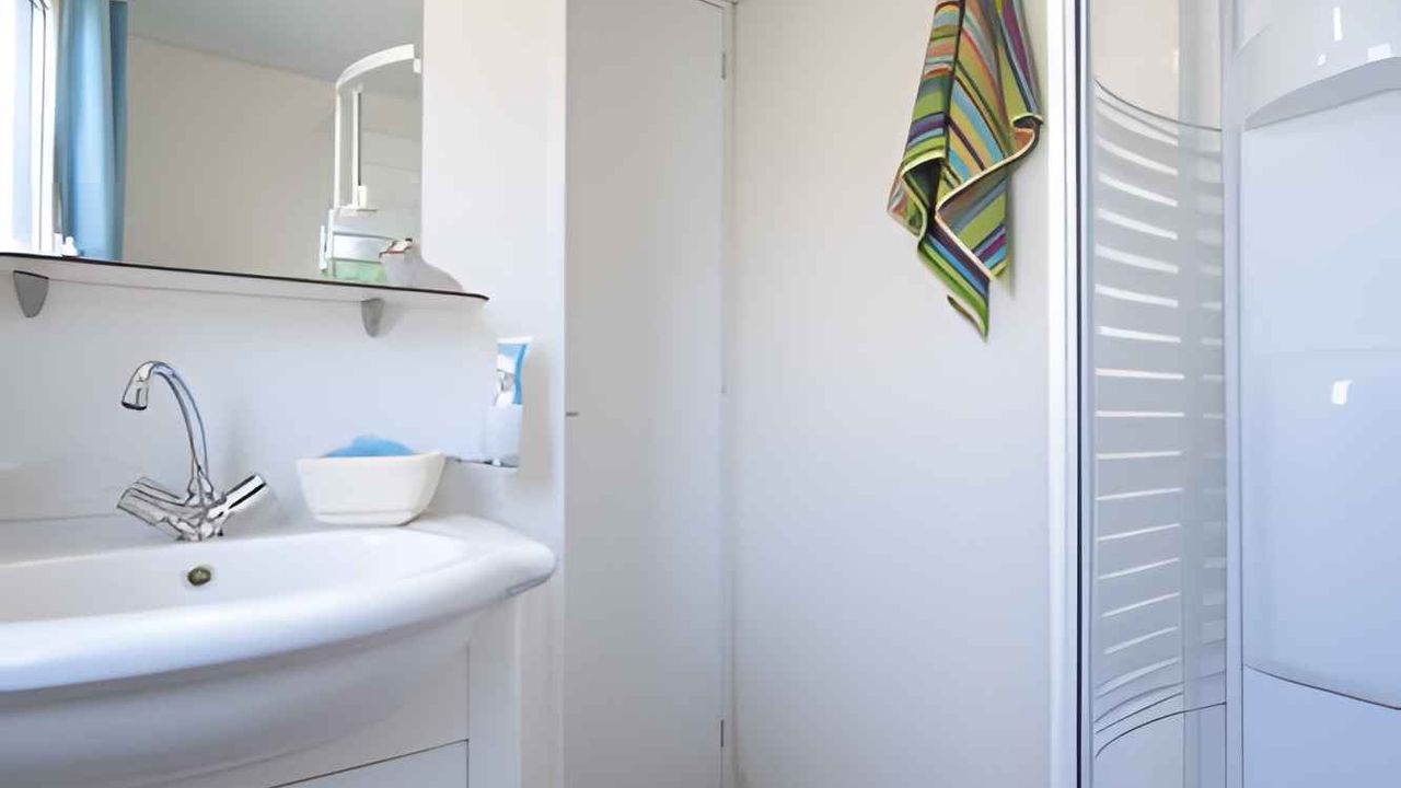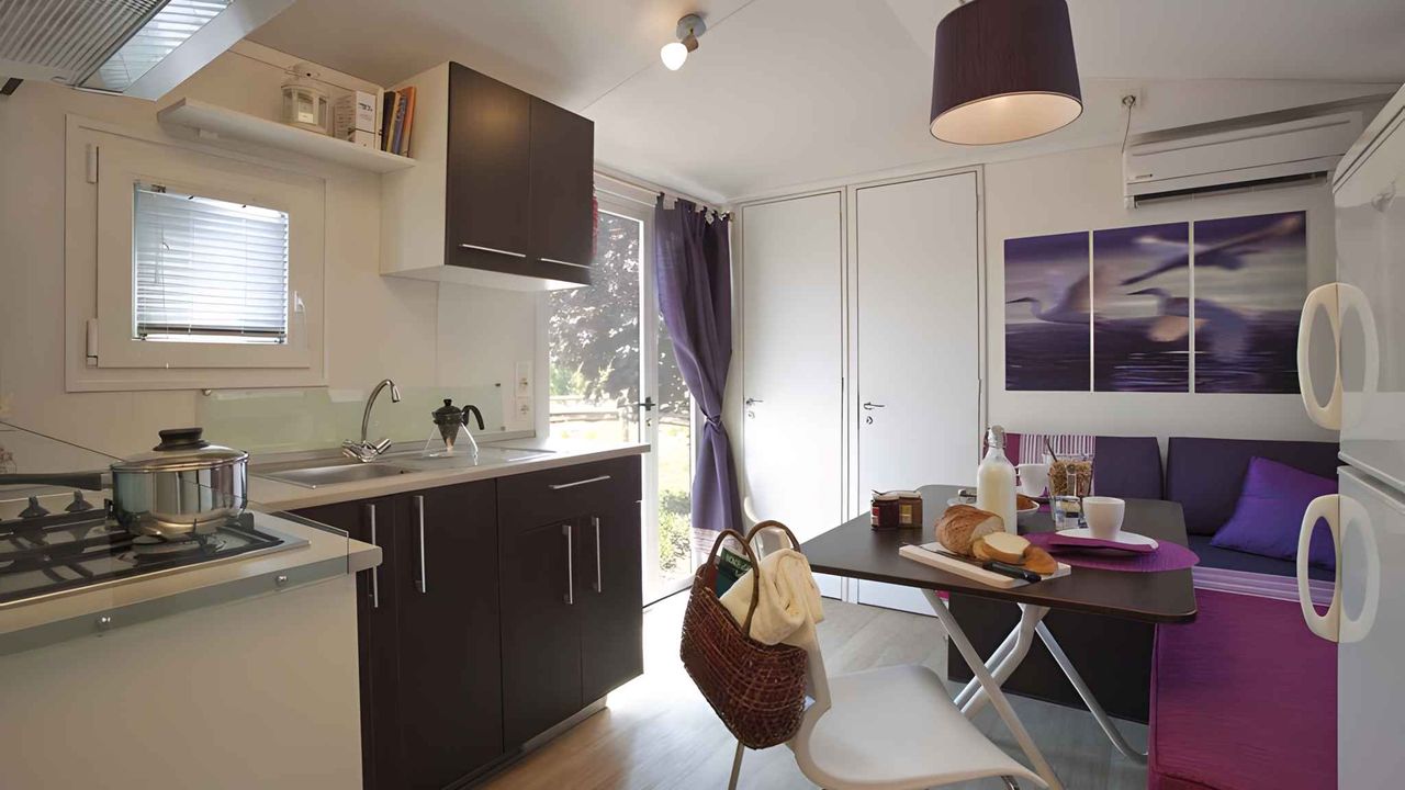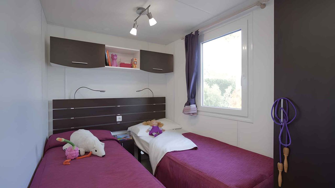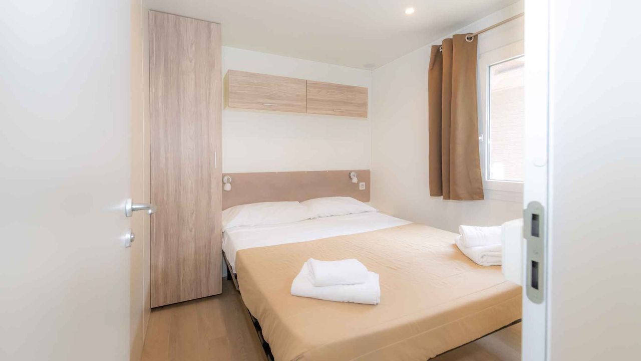 Mobilehome, 1 Etage, 4 Zimmer (davon 3 Schlafzimmer), 33 qm, insgesamt 6 Betten, auf Wunsch zusätzlich 1 Kind bis 2 Jahre im Babybett.