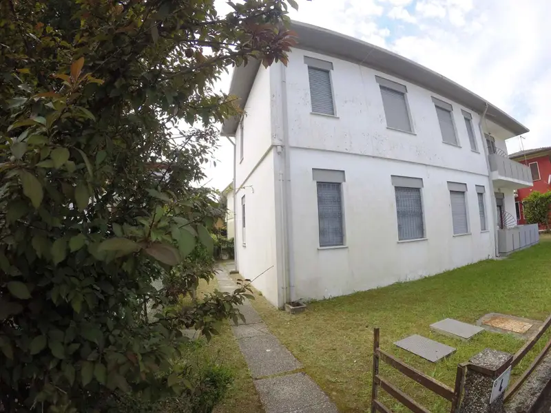 Rosolina Mare. Die Ferienwohnung befindet sich auf einem geschlossenen Grundstück mit Wiese und Bäumen, von einem Zaun begrenzt. Der Vermieter wohnt nicht im Haus oder auf dem Grundstück. Die Zufahrt erfolgt direkt von der Hauptstraße (asphaltiert). Parkplatz in Carport. Parkplatz im Hof Pool.