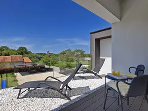 Valbandon. Die Villa befindet sich auf einem 1300 qm großen, geschlossenen Gartengrundstück mit Wiese, Sträuchern und Bäumen, von einem Zaun und einer Hecke begrenzt. Der Vermieter wohnt nicht im Haus oder auf dem Grundstück. Die Zufahrt erfolgt über eine Nebenstraße. Parkplatz (für 4 Pkws) auf dem Grundstück.