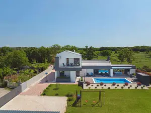 Villa mit Swimmingpool und SpielwieseDie einzeln stehende und 2019 erbaute Villa ist modern und luxuriös eingerichtet. Das Grundstück befindet sich in einem Wohngebiet, am Ortsrand. Auch wegen des Ausblicks vom Grundstück auf das Panorama und der sonnigen und abgeschiedenen Lage ist das Domizil beliebt. Zur alleinigen Nutzung stehen zur Verfügung: Liegewiese, Sonnenliege, Kinderspielplatz, Schaukel, Gartendusche, Grillmöglichkeit, Terrasse und Gartenmöbel. Fußball auf kleinem Feld.