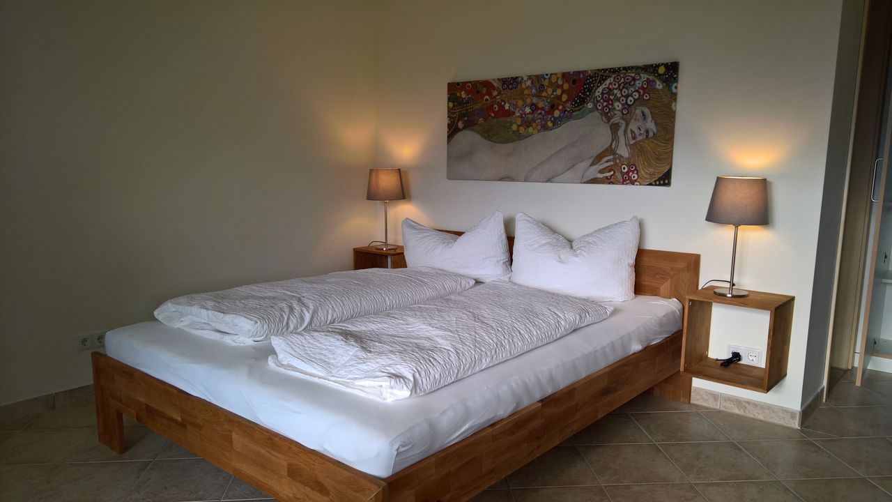 Der Schlafbereich ist mit einem modernen Doppelbett mit Nachttischen und einem großen Einbauschrank ausgestattet.