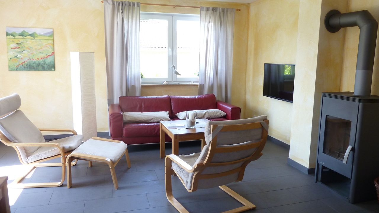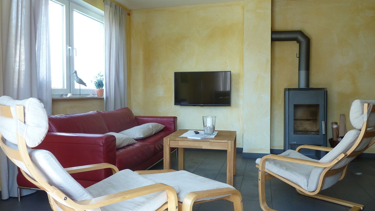 m Wohnbereich befindet sich eine komfortabel Sitzecke mit Polstermöbeln zum Entspannen sowie Sat-TV+DVD-Player.