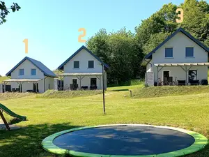 Vor den Hügeln befinden sich drei schöne, komfortable Vier-Personen-Ferienhäuser. Große Terrasse und Blick auf den See. Im Erdgeschoss wohnen und essen, im Obergeschoss schlafen und duschen. Mit kompletter Einrichtung wie zu Hause.