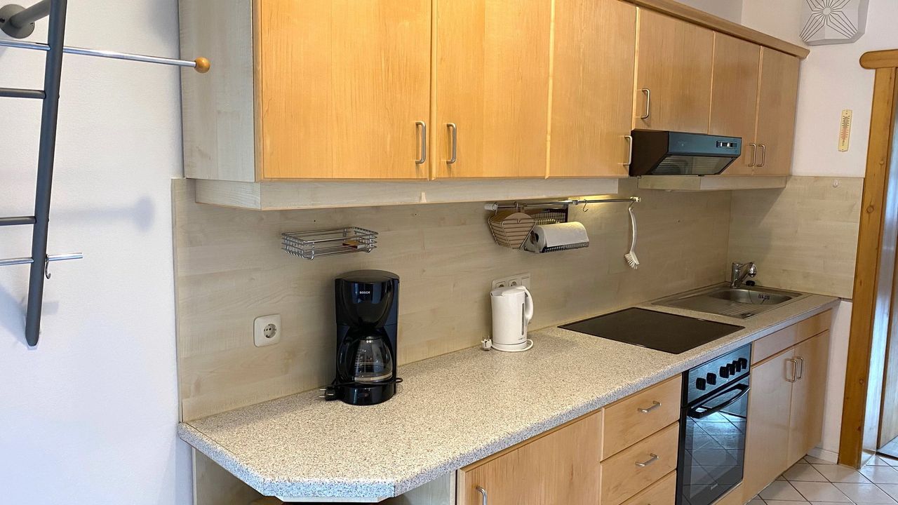 Die Küchenzeile ist mit Cerankochfeld und Backofen, Kühlschrank mit Tiefkühlfach, Toaster, Kaffeemaschine und vielem mehr ausgestattet.