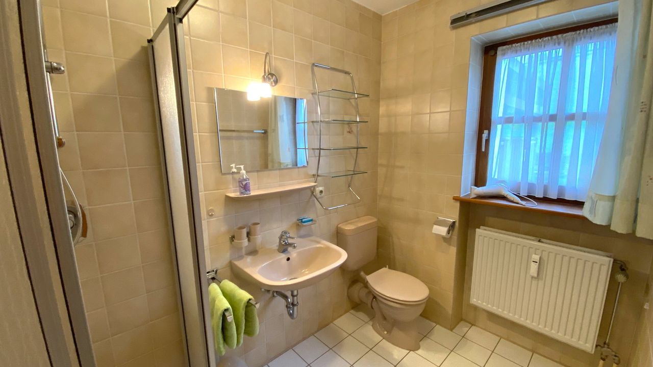 Geräumiges Bad mit Dusche und Fenster. Ein Föhn ist selbstverständlich vorhanden.