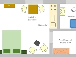 Das Appartement mit Ostseeblick liegt im Obergergeschoss des Landgastohfes "Fischerhus" und bietet einen Blick auf die Ostsee.Es ist ca. 28 qm groß und verfügt über einen Wohnschlafraum mit Doppelbett, einem SAT-TV mit DVD-Player, ein Essbereich mit Tisch und Stühlen, ein Duschbad und eine kleine komplett eingerichtete Küche ( mit Geschirrspüler, Kaffeemaschine, Ceranfeld, Kühlschrank, Wasserkocher)