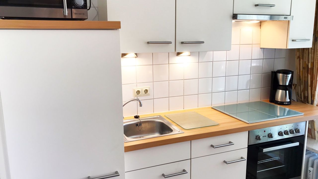 Die toll ausgestattete Küche bietet nicht nur einen Kühlschrank und Ofen, sondern auch eine Mikrowelle und Kaffeemaschine!