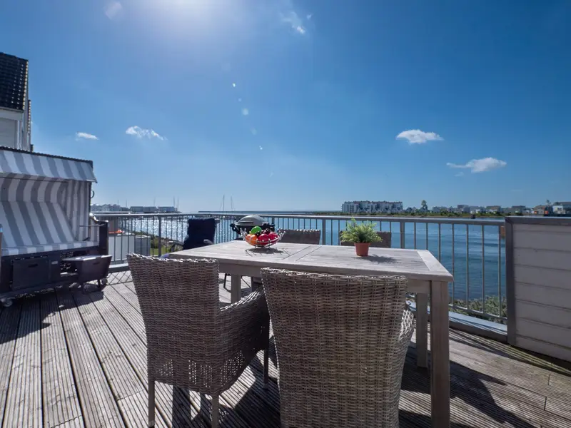Im Fokus steht aber der perfekt umgesetzte lichtdurchflutete Wohn- und Essbereich mit Holz befeuertem Kaminofen, bodentiefen Panoramafenstern, welcher loftartig gestaltet ist, sodass alle Räume fließend ineinander übergehen und sich der Wohnbereich mit der Natur verbindet. Die Integration der offenen Küche mit hervorragender Ausstattung und funktionalem Design, steht dem gemütlichen Beisammensein auch beim Zubereiten von allerlei Köstlichkeiten nichts im Wege. Die Wasserkulisse vor dem Essbereich mit 180 Grad Panoramablick auf den gesamten Hafen und die Ostsee ist hierbei zum Greifen nah – das ist Ostseeflair. Den zweiten Nordbalkon (ca. 8m²) betritt man über den Wohnbereich, hier können es sich unsere Gäste auf einer zusätzlichen Bestuhlung gemütlich machen und bei einem Sundowner mit Abendsonne den Tag ausklingen lassen.