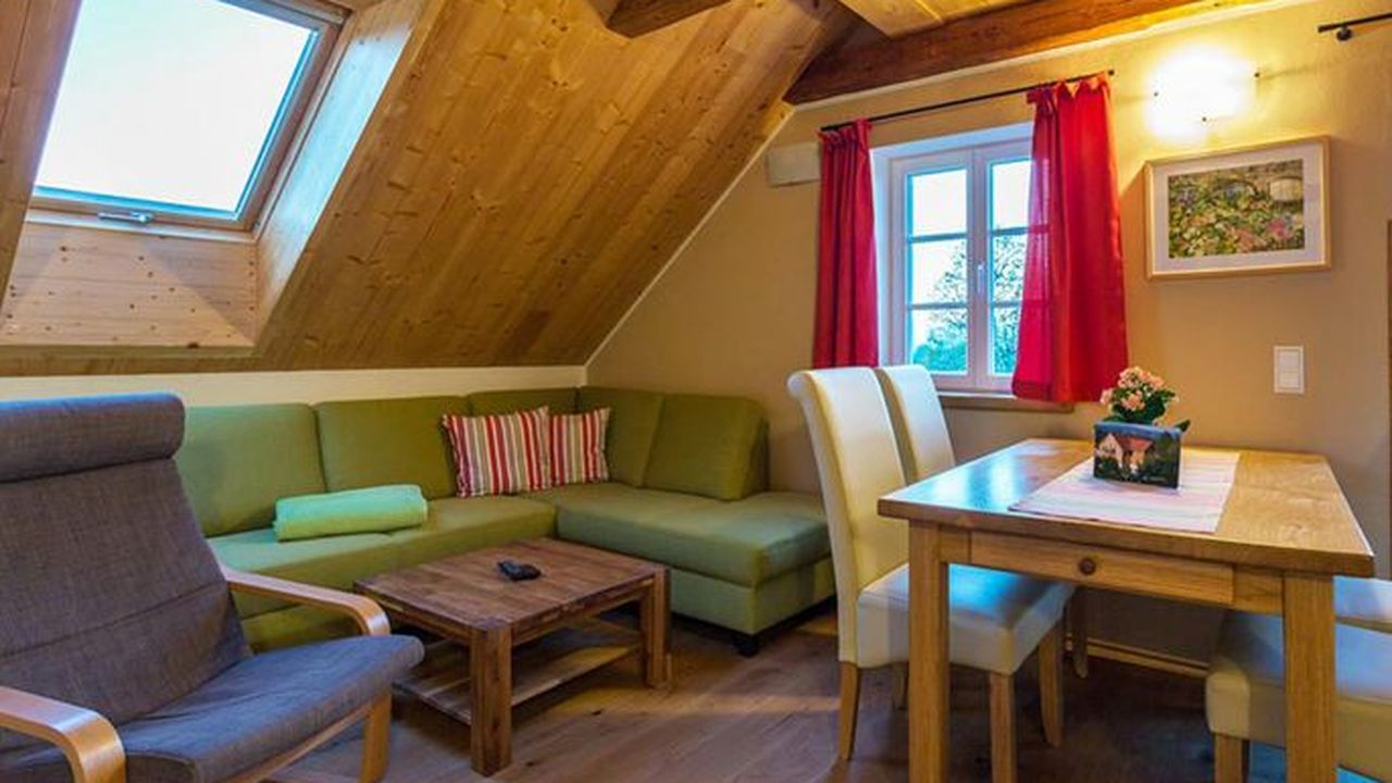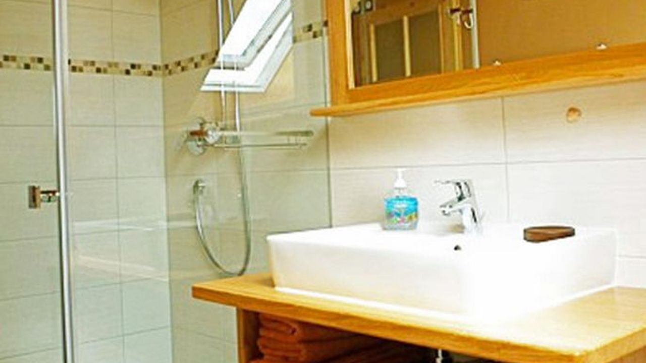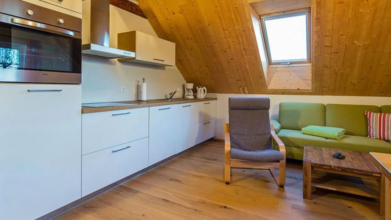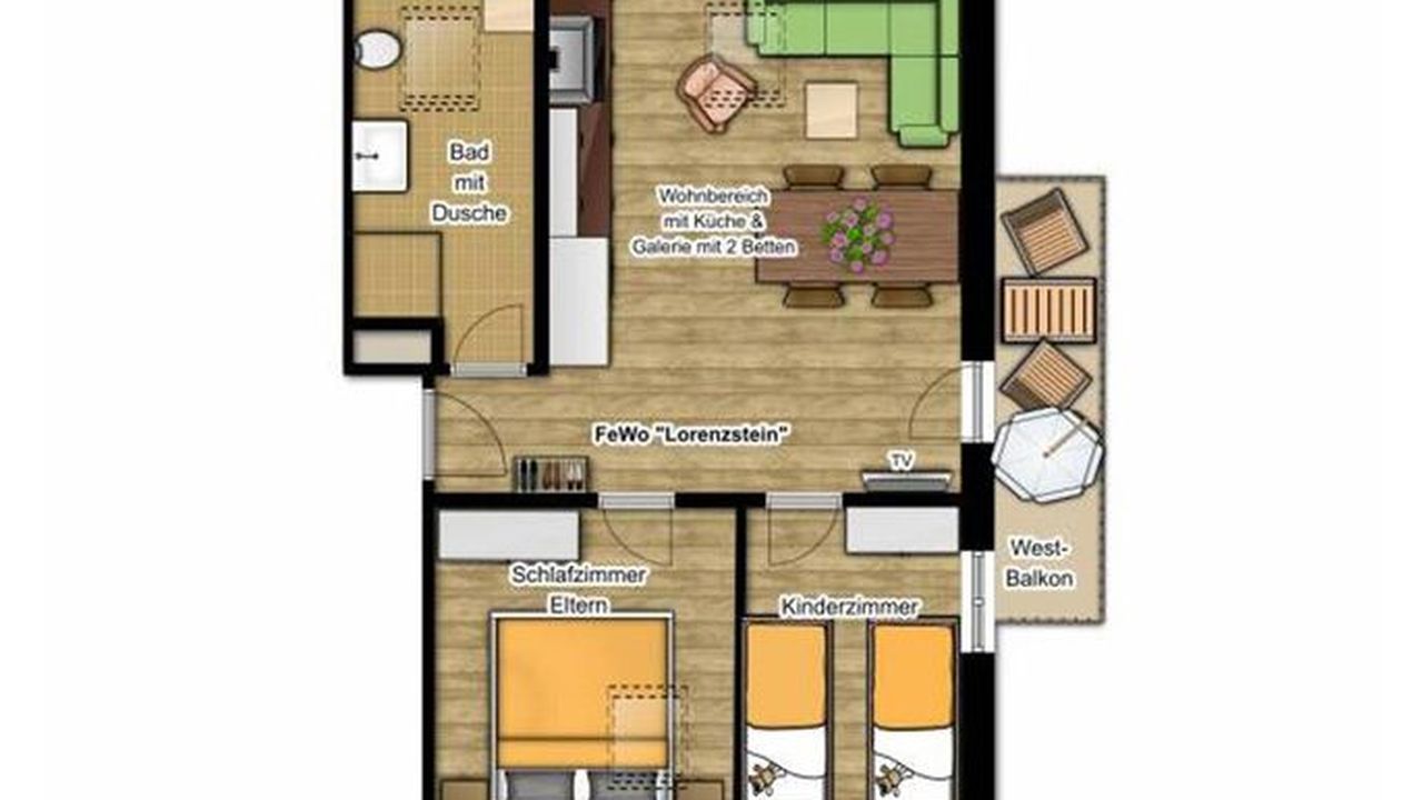 Die Ferienwohnung Lorenzstein liegt im Dachgeschoss des Hauses und ist über den Treppenflur erreichbar.Sie ist ausgestattet mit zwei Schlafräumen (1x mit Doppelbett (180 cm x 200 cm) und Schrank und 1x mit zwei Einzelbetten und Schrank). Oberhalb des Wohnbereiches auf der Galerie besteht die Möglichkeit von zwei weiteren Schlafmöglichkeiten (2 Betten).