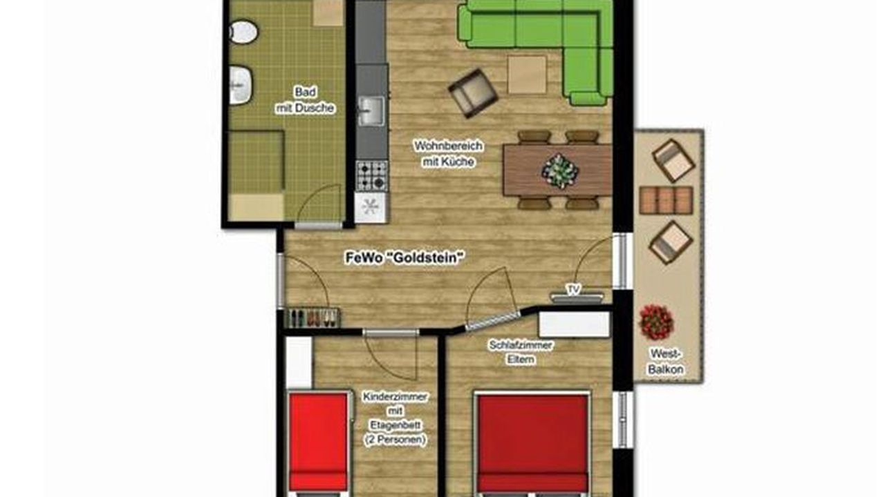 Die Ferienwohnung Goldstein liegt im Obergeschoss des Hauses und ist über den Treppenflur erreichbar.Sie ist ausgestattet mit zwei Schlafräumen (1x mit Doppelbett (180 cm x 200 cm) und Schrank und 1x mit Etagenbett und Schrank). Der Wohnbereich verfügt über eine voll ausgestattete Küche mit Geschirrspüler, großem Esstisch, komfortable Sitzecke mit Schlafcouch und Flat-TV. Das Tageslicht-Badezimmer verfügt über Dusche und WC. Der West-Balkon ist über den Wohnbereich erreichbar. Kostenfreies WLAN steht zur Verfügung.