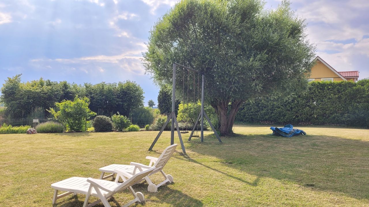 Die Terrasse ist mit Sonnenschirm und diversen Gartenmöbeln ausgestattet.