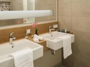 Die hellen und großzügigen Bäder verfügen nicht nur über eine große Dusche mit Regenfunktion. sondern auch über eine Toilette mit Fenster sowie ausreichend Abstellmöglichkeiten um das Waschbecken. Selbstverständlich steht ein Föhn für die Dauer des Aufenthaltes zur Verfügung. Das Angebot wird ergänzt durch eine exklusive Auswahl an französischen Bio Kosmetikprodukten.