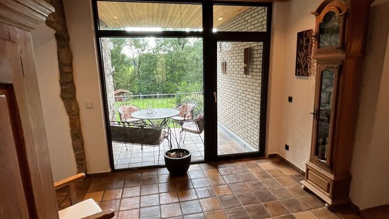 Die Wohnung befindet sich in einem historischen Bruchsteinhaus mit einem großen Anbau.Sie betreten die schöne Ferienwohnung über einen eigenen überdachten Hauseingang. Nach Öffnen der Haustür betreten Sie zuerst die große Wohndiele mit ihrer großen Bruchsteineand und dem aufregenden Blick auf die große Loggia. Von hieraus eröffnet ein toller Blick auf das große Grundstück, den dort befindlichen Teich und die tolle Natur.