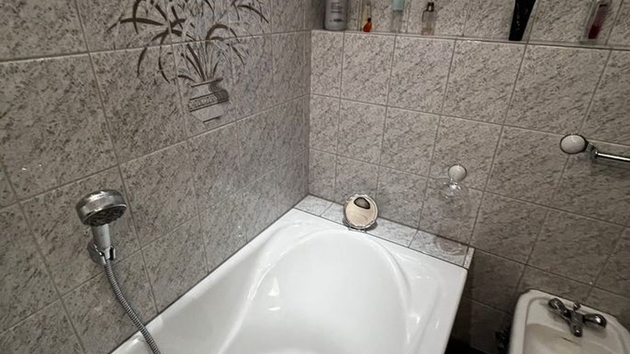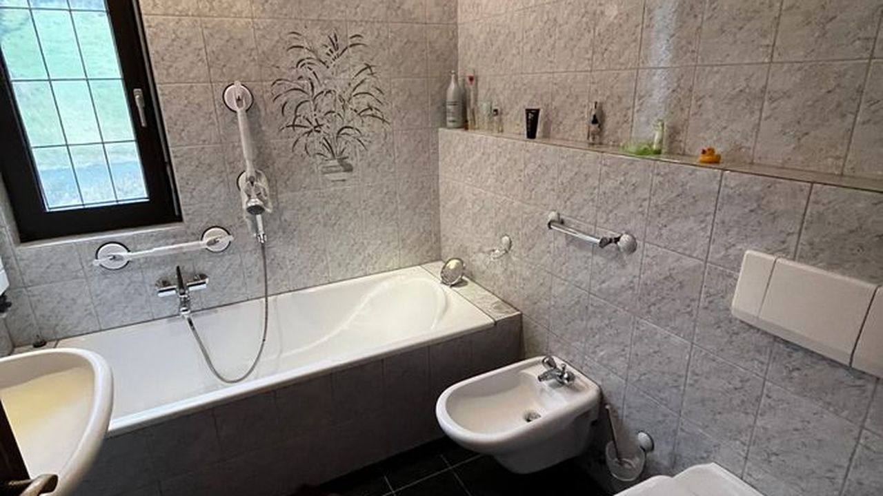 Dierekt neben dem Schlafzimmer liegt ihr helles Badezimmer mit Waschbecken, großem Spiegel, PD, Toilette und einer weißen, einladenden Badewanne. Das Bad verfügt natürlich über ein Fenster und Hologenspots in der weißen Decke.