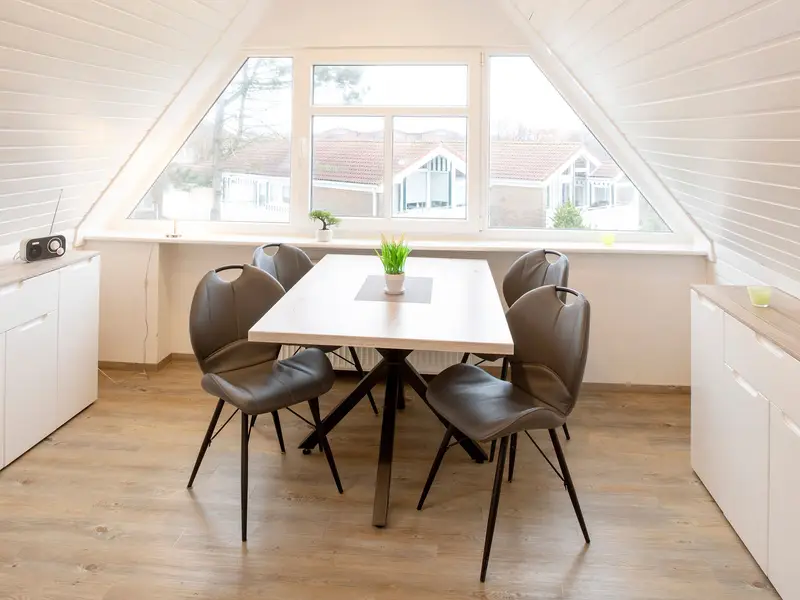 Im Dachgeschoß unseres Ferienhauses liegt mit circa 58 Quadratmetern die behagliche Ferienwohnung „Strandvogt 5" nahe des Langeooger Ortskerns.Die separate, geräumige und helle Küche mit Essplatz ist komplett ausgestattet mit einem 4-Plattenherd, Backofen, Geschirrspülmaschine, Kaffeemaschine, Wasserkocher, Toaster, Besteck und Geschirr. Am gemütlichen Essplatz genießen Sie Ihre Mahlzeiten bei einem wunderschönen Blick aus dem großen Giebelfenster nach draußen.