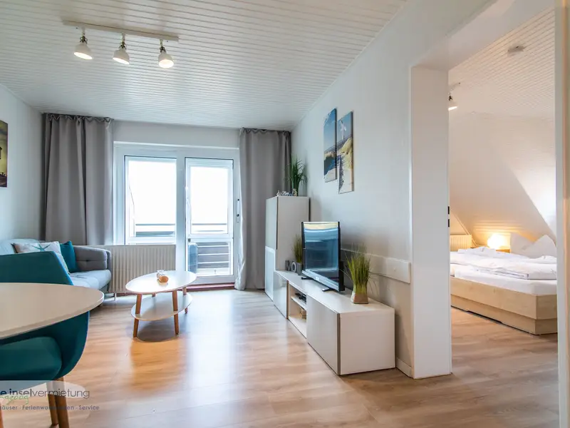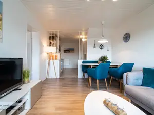 Wohnzimmer | Der Wohnbereich in der FeWo auf Langeoog lädt mit seinem kleinen Essbereich und der gemütlichen Coach zu gemeinsamen Abenden ein. |