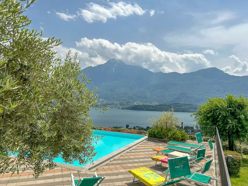 Zur Seeseite liegt der, mediterran bepflanzte Gemeinschaftsgarten mit solarbeheiztem Pool, Kinderpool und Kinderspielgeräten. Sowohl der Garten als auch der Poolbereich mit seinen zahlreichen Plätzen, bietet allerlei Möglichkeiten, zum Entspannen und die Sonne und Wärme zu genießen. Bike-Werkstatt und Bike-Unterstellmöglichkeit, Tischtennisplatten und Tischfußball runden das Urlaubsambiente für Familie und Freunde ab. Die Lage: oberhalb von Domaso am Westufer innerhalb von Vercana, einem sonnenverwöhnten Bergdorf mit Weinkantinen. Im Umfeld sind Weinberge, Wiesen, Wohn- und Ferienhäuser.