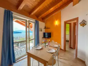 "La Collina" besteht aus zwei Ferienhäusern mit unterschiedlich großen Ferienwohnungen und einem Pool-Bungalow. Die beiden Ferienhäuser stehen seitlich versetzt - mit herrlichem Seeblick. Alle Ferienwohnungen haben externe Eingänge und einen privaten Außenbereich zur Seeseite, die durch die Sonnenhanglage pure Urlaubslust vermitteln. Alle Balkone und Terrassen sind großzügig und einladend, mit Esstischgarnituren und Liegestühlen. Die Namen der Ferienwohnungen sind angelehnt an Früchte und Oliven, die hier in dem milden Klima gedeihen.Die Wohnung Nocciola mit einem überdachtem Natursteinbalkon zur Seeseite mit schönem Panoramablick.