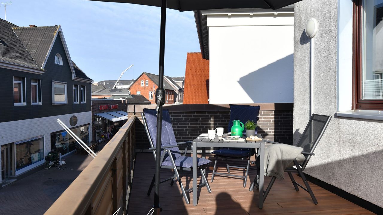 20m² Balkon mit Gartenmöbeln zur Südseite und mit Blick in die Fußgängerzone