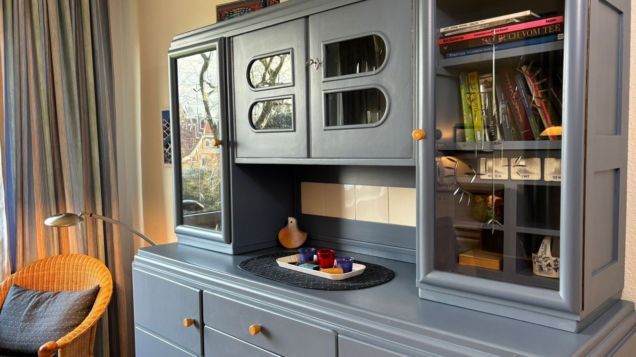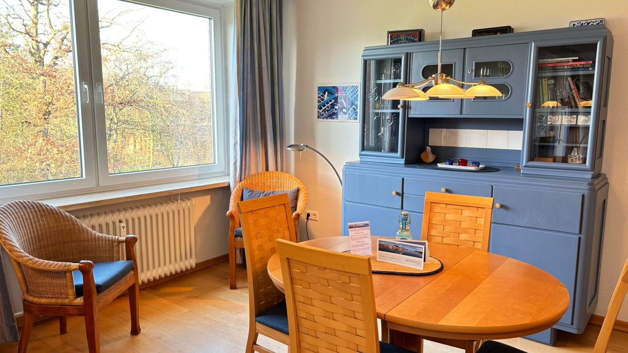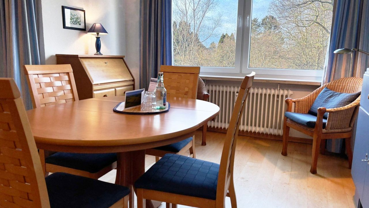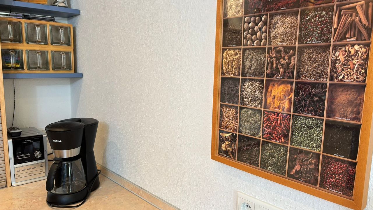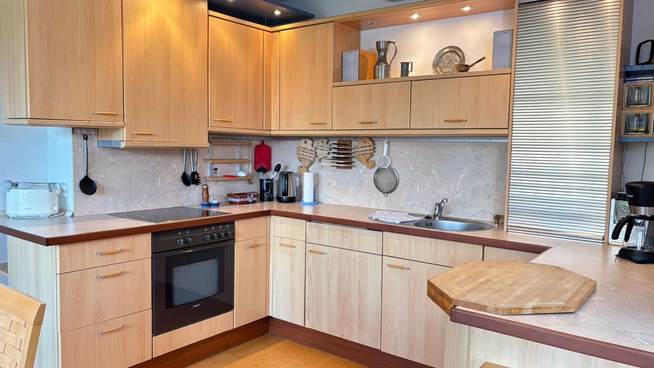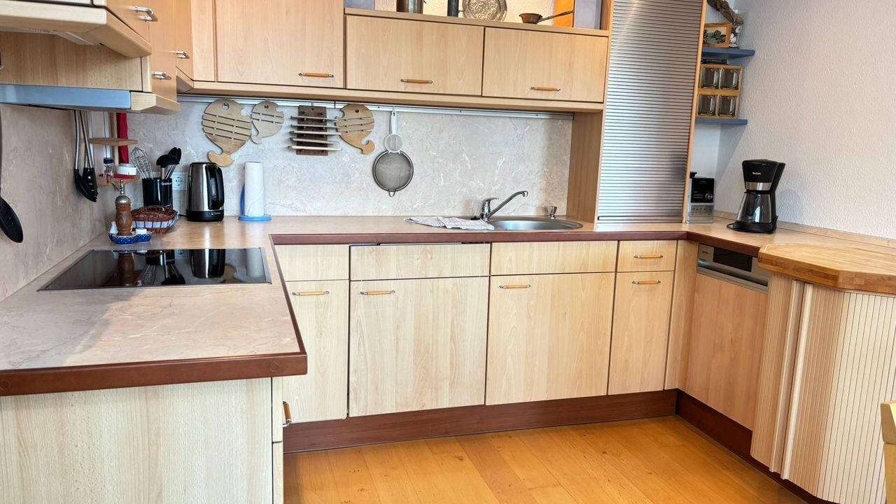 Der großzügige Wohn- und Essbereich lädt zum Verweilen ein. Hier finden Sie einen Esstisch, ein Sofa und einen Schreibtisch/Sekretär, ideal für kleine Arbeiten oder Urlaubsplanungen. Die angrenzende offene Küche ist funktional ausgestattet mit einem Cerankochfeld, Elektrobackofen, kleinem Kühlschrank mit Gefrierfach und einer Spülmaschine. Für den perfekten Start in den Tag stehen Ihnen eine Filterkaffeemaschine, Wasserkocher, Toaster und Eierkocher zur Verfügung.