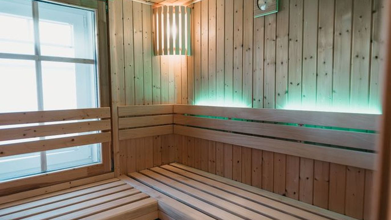 Saunabad im Erdgeschoss, mit bodengleicher Dusche, Wc und Waschbecken.