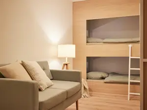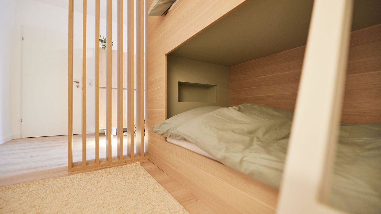 Ein weiteres Stockbett befindet sich nochmals separat. Diese sind durch die Kojen-artige Bauform gemütlich und sorgen für einen ruhigen Schlaf.