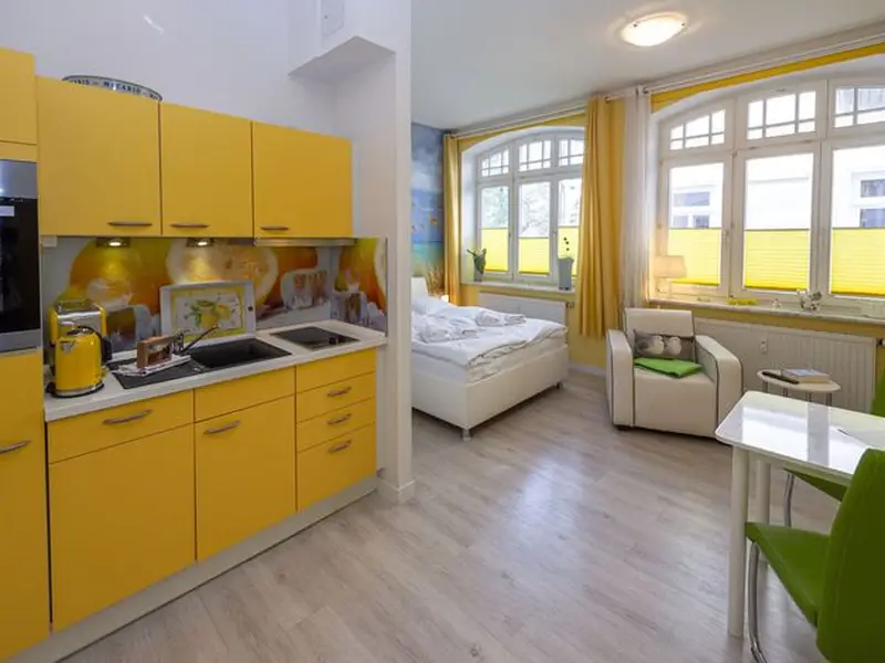 Wohnung 08:Dieses angenehm ruhig gelegene 1-Raum-Appartement erwartet Sie im ersten Obergeschoss der Villa Sirene. Ihr Zuhause auf Zeit ist rund 28 m² groß und strahlt durch seine moderne, freundliche Einrichtung eine behagliche Wohlfühl-Atmosphäre aus. Wenn Sie eines der großen Fenster öffnen und hinausschauen, können Sie einen seitlichen Blick aufs Meer erhaschen.