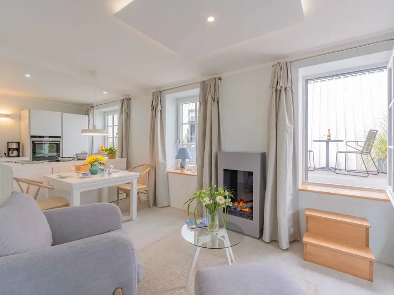 Das Dachterrassen-Loft befindet sich in einem historischen Gebäudekomplex im Herzen der Altstadt Kappelns, 20 Meter von der Fußgängerzone entfernt. Der Gebäudekomplex besteht aus mehreren Gebäuden, die sich um einen sehr schönen Innenhof anordnen – dies alles von keiner Straße aus einsehbar. Die Südseite des Gebäudekomplexes reiht sich als Stadthaus in die Häuserfronten der Mühlenstrasse ein, die Nordseite liegt an der Straße Schanze. Hier befinden sich neben dem Zugang zu dem Dachterrassen Loft und den weiteren Ferienwohnungen Kappeln 333, Kappeln 334, Kappeln 335, Kappeln 336 auch die Zufahrten zu den Garagen. Der sehr schön gestaltete Innenhof, Rosen umrankt und mit Brunnen, Strandkorb sowie Sitzecken, ist eine Oase mitten in Kappeln. Die Namensgebung des Dachterrassen Lofts Kappeln 337 gilt der zentralen Lage: 3 Minuten zum Bäcker, 3 Minuten zum Bio-Laden und 7 Minuten vom Strandkorb der Dachterrasse aus zu Hafen – alles zu Fuß.Im nordischen Design charmant gestaltetes, sehr hochwertig ausgestattetes 78 Quadratmeter großes Dachterrassen-Loft mit eigener Dachterrasse und Fußbodenheizung. Es befindet sich in Süd-West- Lage im 1. Stock des Gebäudekomplexes mit Zugang über den Innenhof und ist daher absolut ruhig und hell. Die Dachterrasse ist über die angefertigte Terrassentür des Wohnbereiches zu erreichen und bietet mit Strandkorb plus weiteren Outdoor Möbeln ein perfekt geschütztes, nicht einsehbares Wellnesserlebnis. Das Loft besteht aus einem großzügigen offenen Wohn-Küchen-Schlafbereich sowie einem modernen Bad. Die Küche der Luxusmarke Bulthaup besteht aus einer Küchenzeile, in der sich Spüle, Geschirrspülmaschine sowie der Kühlschrank mit Fresh Funktion und der Multifunktionsofen befinden. Die Insel bietet Induktionsfeld und über Soft Close Schubladen jede Menge Stauraum. Sämtliche Geräte sind von hochwertigen Markenherstellern wie Miele, Siemens oder NEFF. Kaffeemaschine, Wasserkocher plus Toaster machen die Küche komplett. Den Mittelpunkt des Wohnbereiches bilden 2 sehr gemütliche Sessel mit Hocker sowie Couchtisch und der Kamin – elektrisch, dessen realistisches Flammenbild zusätzlich für Behaglichkeit sorgt. TV lässt sich via Teleskopaufhängung für ideale Sicht sowohl für Sessel wie auch für Perspektive vom Bett aus einstellen. Radio und WLAN sind selbstverständlich. Im Schlafbereich wartet ein Boxspringbett der Luxusklasse und jeweils einem Nachttisch mit Nachttischlampe. Stauraum zum Hängen und Legen findet sich im Kleiderschrank. Im Eingangsbereich befinden sich Garderobenpaneele mit Haken und Ganzkörperspiegel. Das Bad besteht aus übergroßer bodentiefer / begehbarer Dusche mit Kopf- und Handbrausebrause, WC, Waschtisch, Handtuchhaltern, Handtuchheizung und Bademänteln sowie einem Fön.