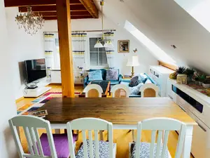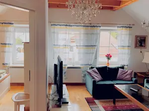 Wohnung im Dachgeschoss, ca. 51 qm, Zugangvon außen. Sichtbare Balken, großes Wohnzimmer, 2 Schlafzimmer, Küche mit Geschirrspüler, Wannen-und Duschbad, Gäste-WC, Parkett und Fliesen. Teilw. Fußbodenheizung, großer Balkon, W-Lan, TV.