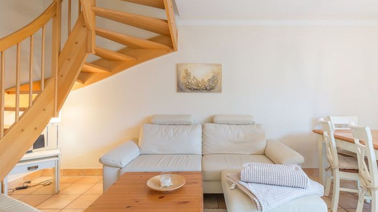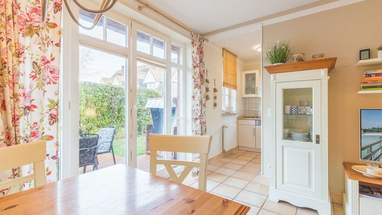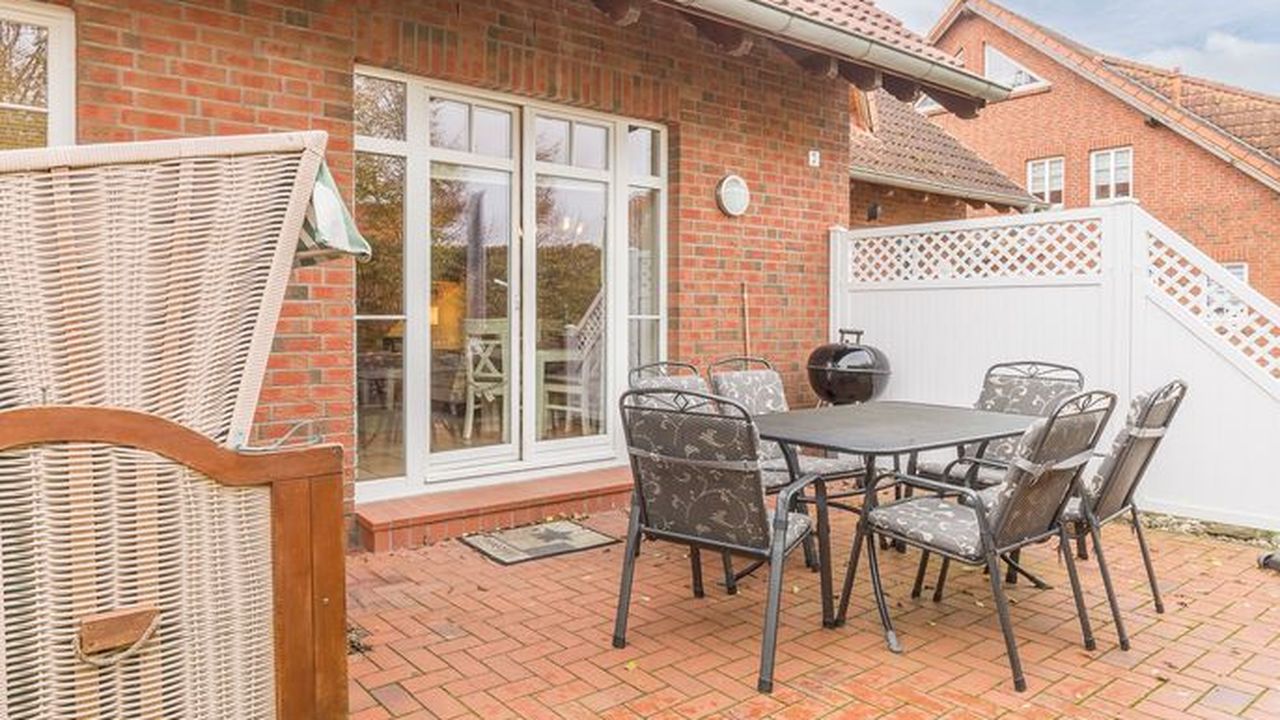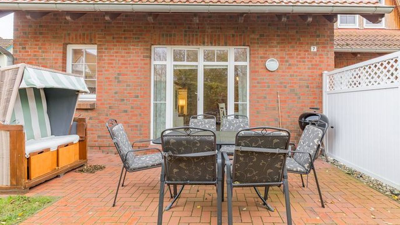 Vom Wohnzimmer aus gelangen Sie auf die begrünte, kleine Terrasse. Die vorhandene Hecke bietet Sichtschutz und Privatsphäre für das Familienfrühstück auf der Terrasse. Auf der andern Seite befindet sich der Außenstellplatz. Ein schöner Strandkorb auf der Terrasse rundet das Angebot ab.