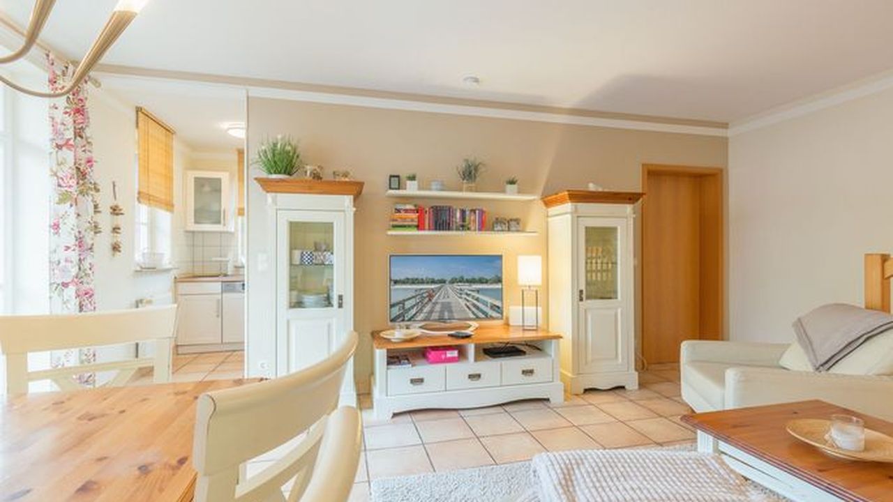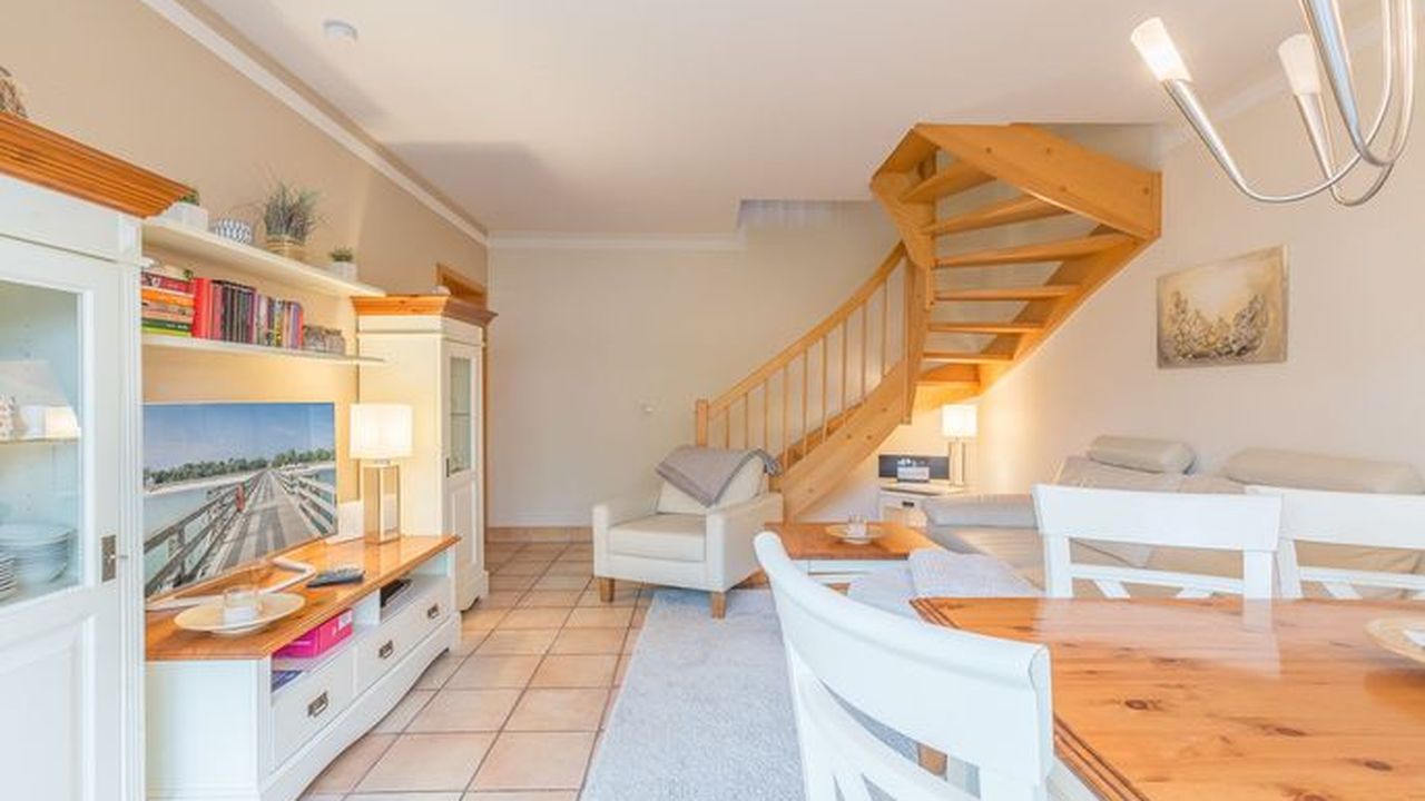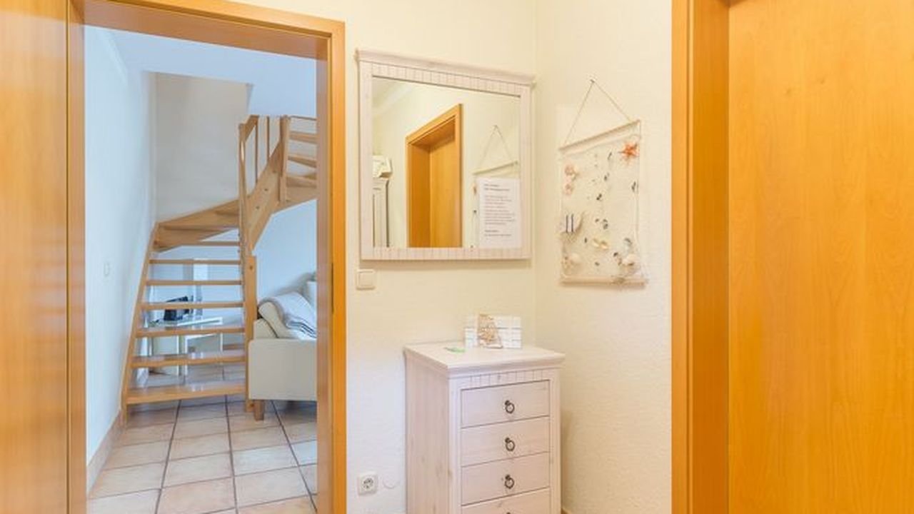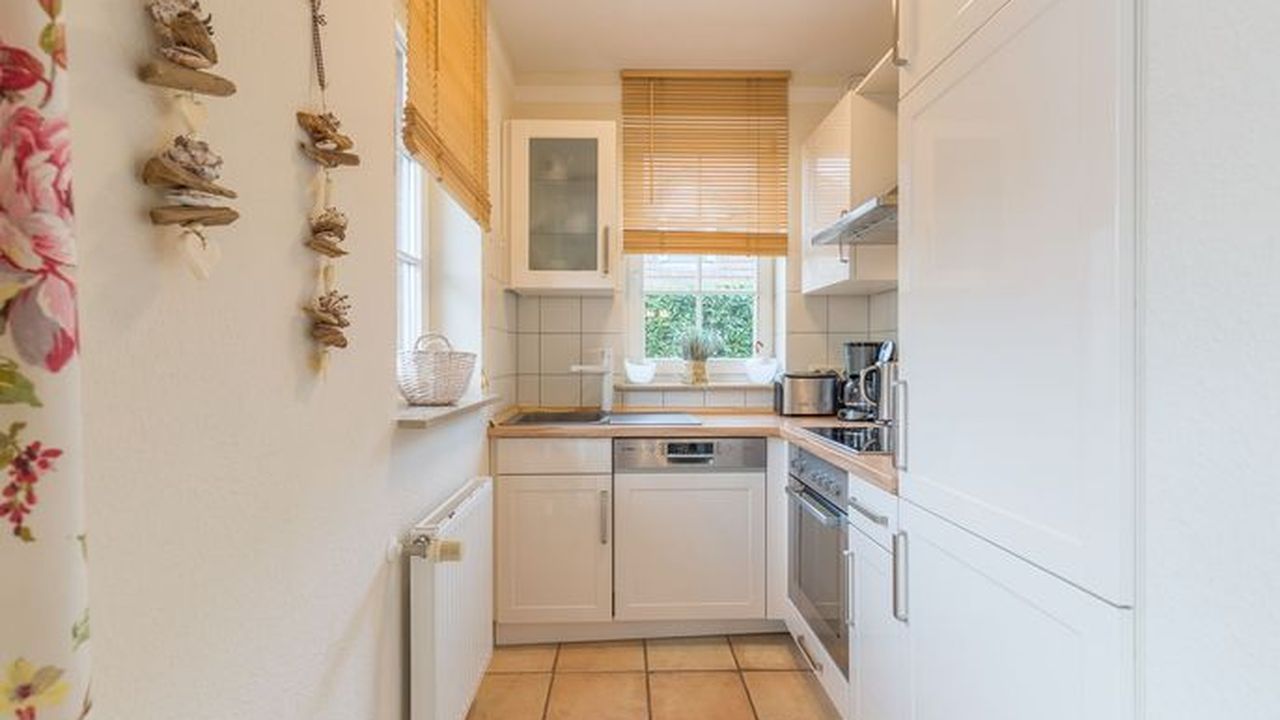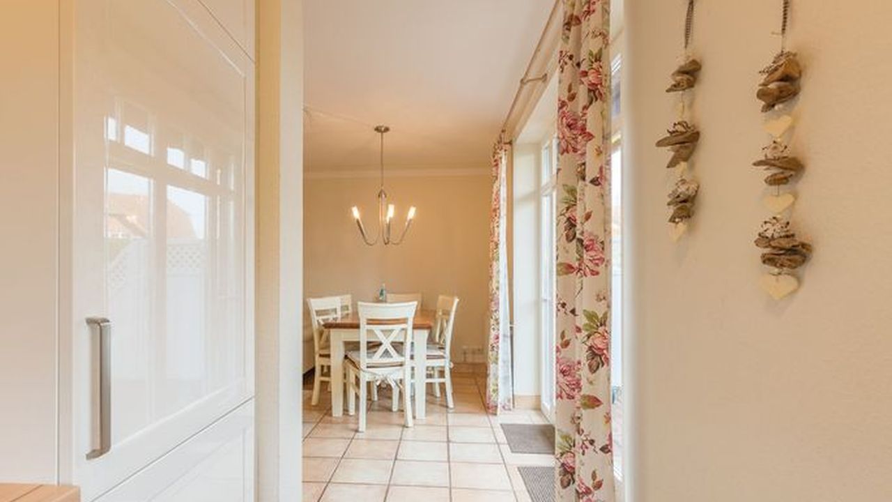 Sie betreten das Ferienhaus und befinden sich im Flur. Von hier aus erreichen Sie das Wohnzimmer. Vom Wohnbereich aus gelangen Sie in die offene Küche. Sie ist mit einem Geschirrspüler, einer Kaffeemaschine und allem, was für die Zubereitung Ihrer Mahlzeiten benötigen, ausgestattet.