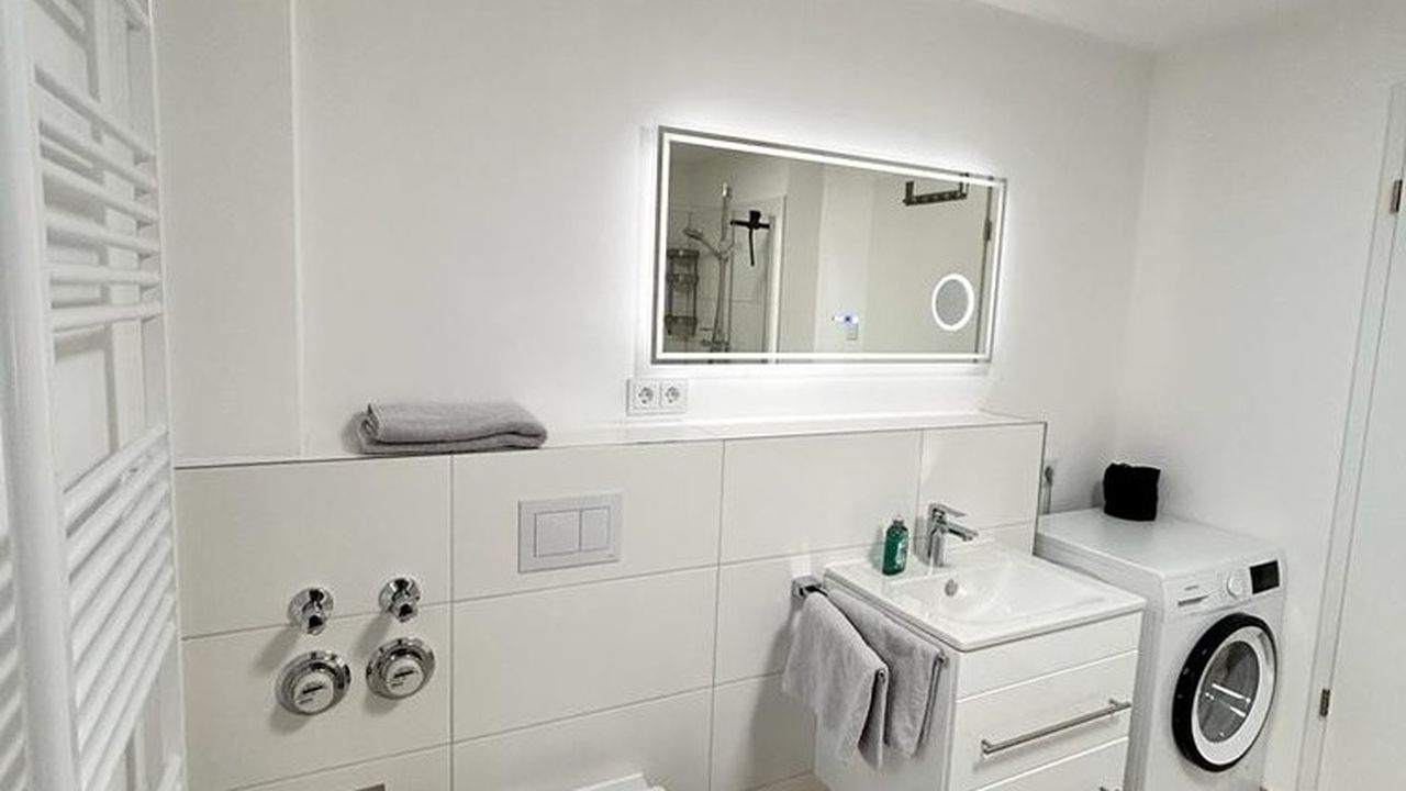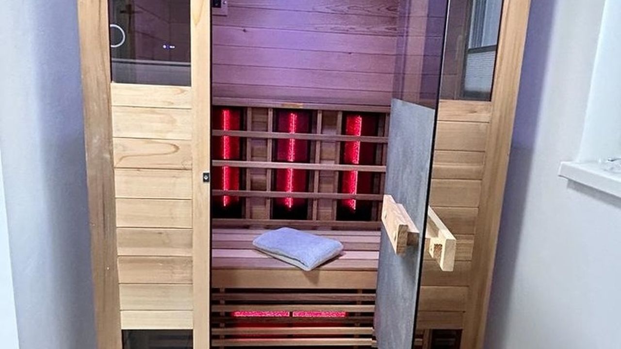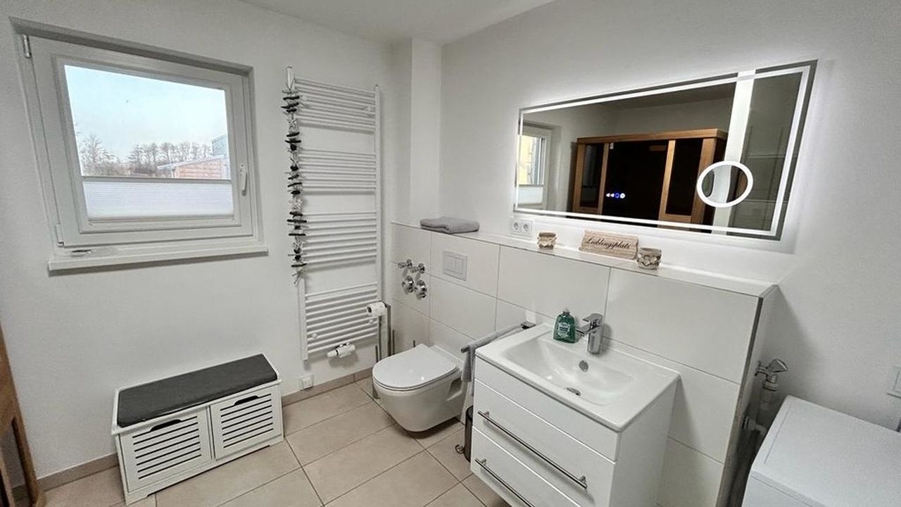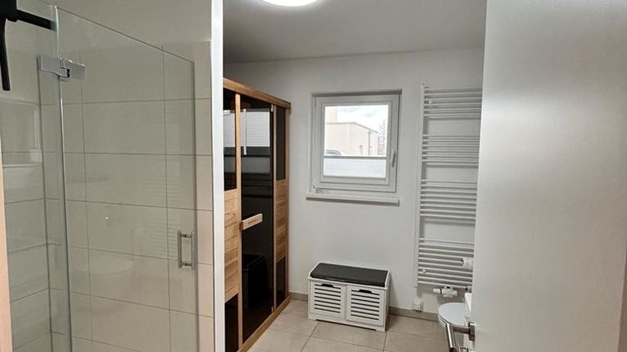 Das Bad ist mit einer geräumigen begehbaren Dusche, Waschbecken und einem WC ausgestattet. Zudem befindet sich hier eine Infrarotkabine (keine klassische Sauna), sowie eine Waschmaschine.