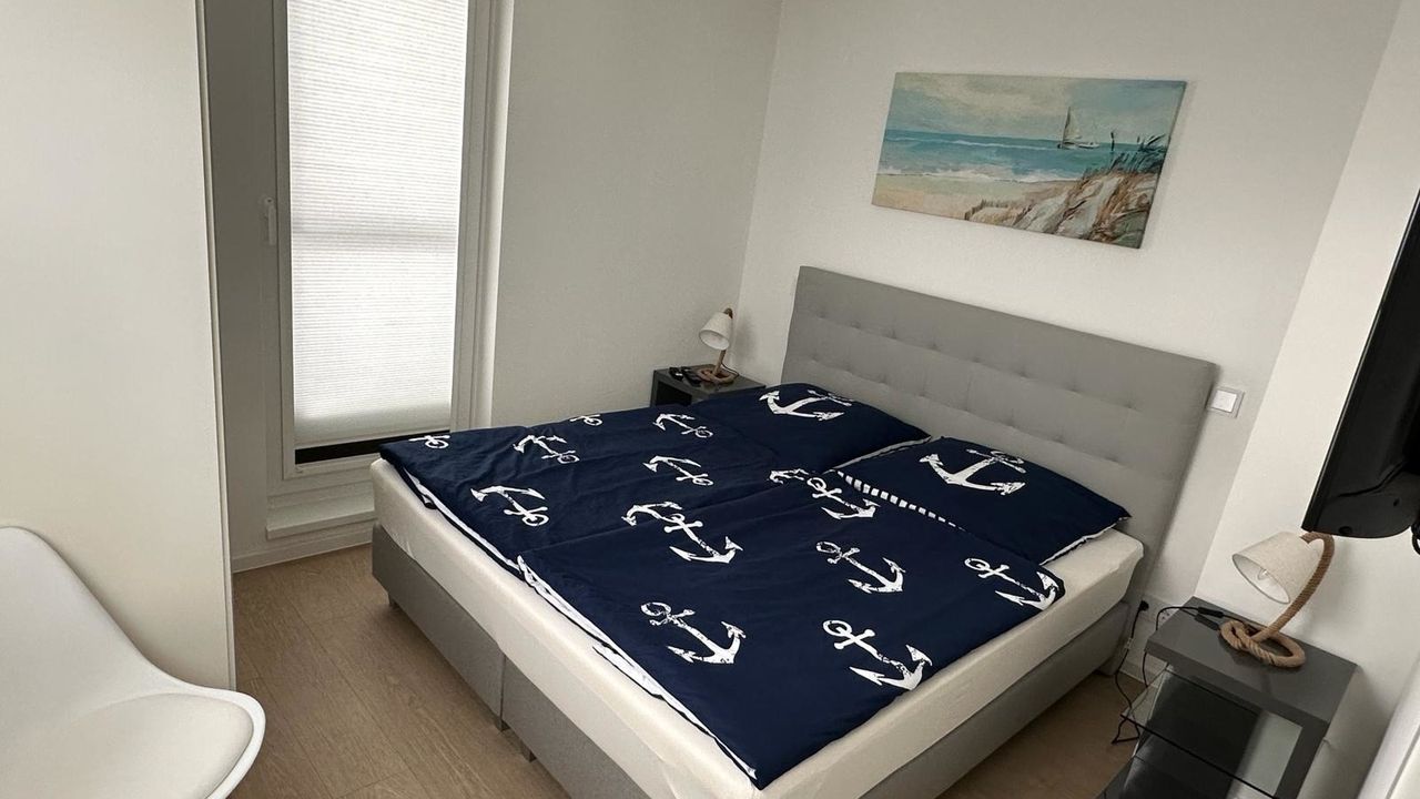 Das Elternschlafzimmer ist mit einem sehr bequemen Boxspringbett der Größe 180 x 200 cm mit getrennten Matratzen sowie einem geräumigen Schrank und einem Stuhl ausgestattet.