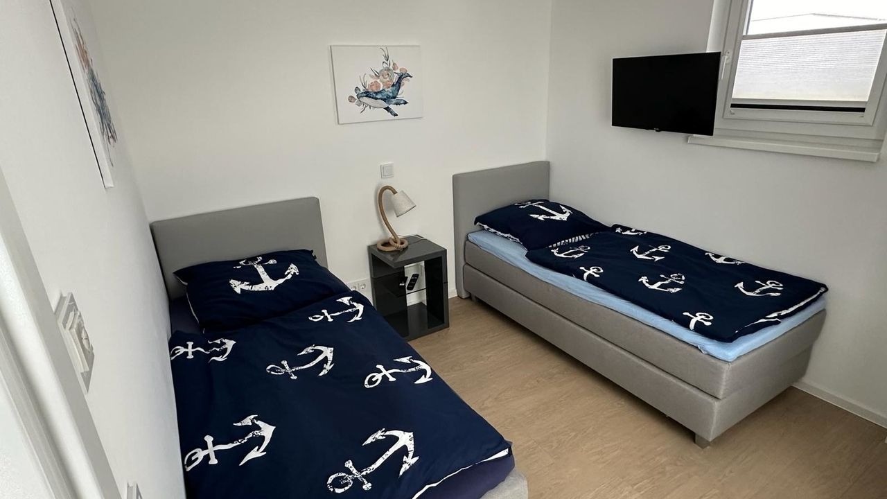 Im Kinderschlafzimmer befinden sich zwei separate Boxspringbetten, jeweils der Größe 90 x 200 cm und ebenfalls ein Stuhl und ein Kleiderschrank.