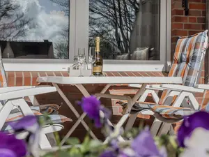 Zum Sonnen bietet sich auch in der kühleren Jahreszeit die windgeschützte Terrasse mit großer Rasenfläche an.