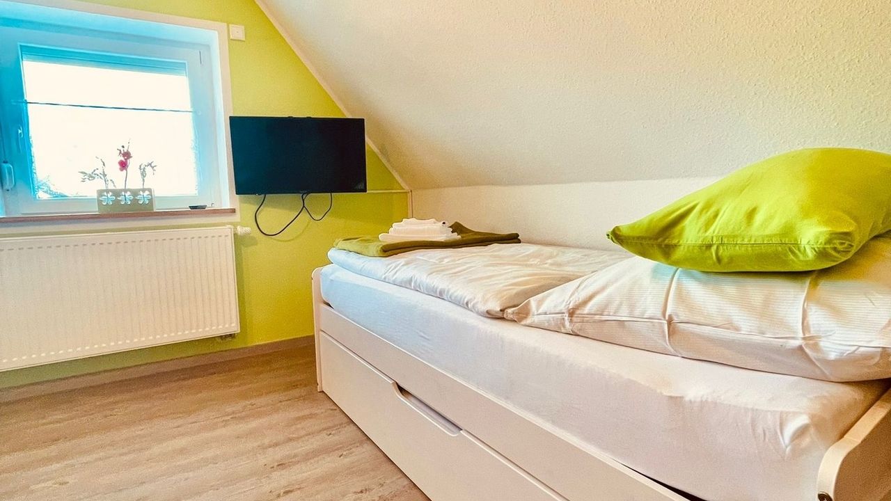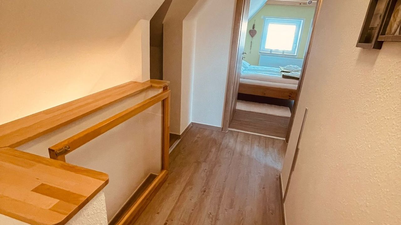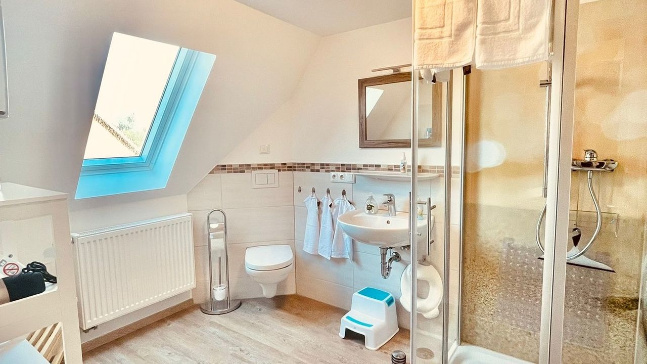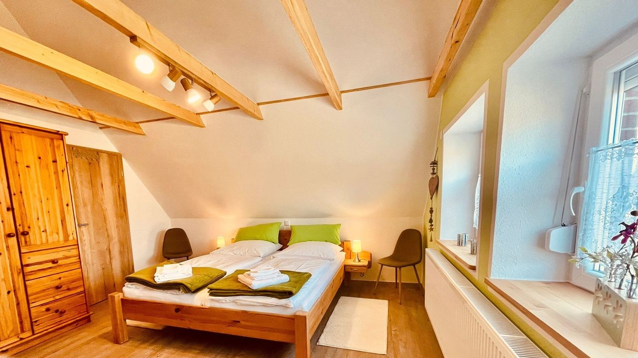 Ein weiteres großes Schlafzimmer mit einem Doppelbett 1,80 x 2,00 m, einem ausziehbaren Kojenbett 0,90 x 2,00 m für 2 Personen und ein Kleinkinderbett befinden sich im geräumigen Obergeschoß. Ein weiteres Duschbad mit WC ist verfügbar.