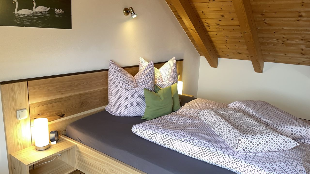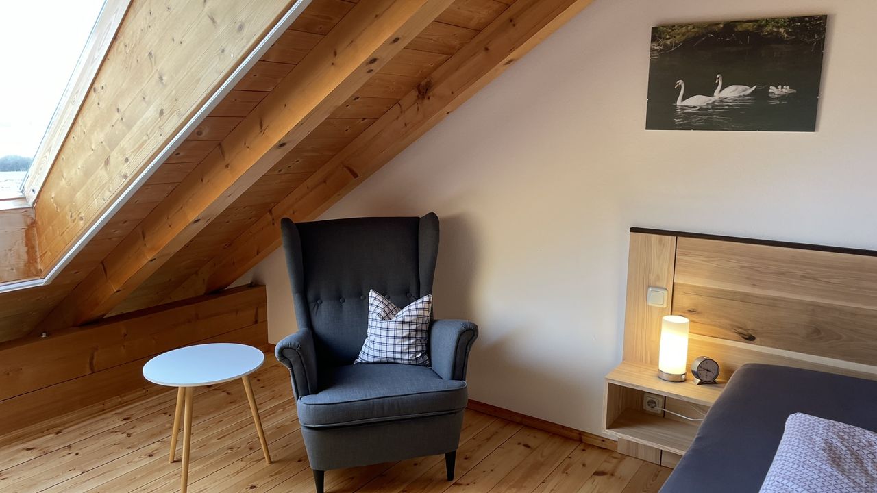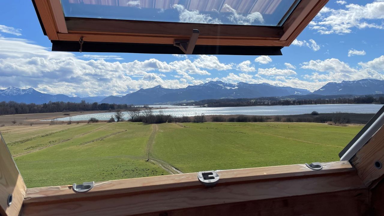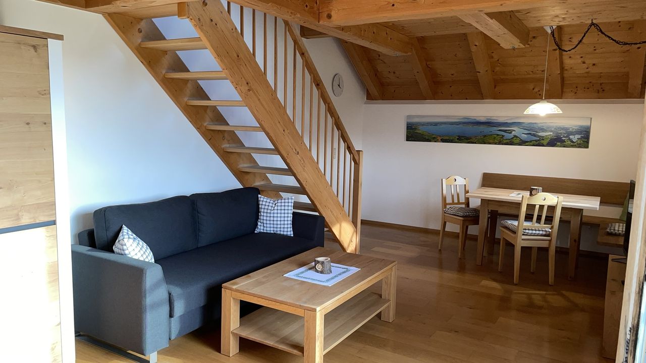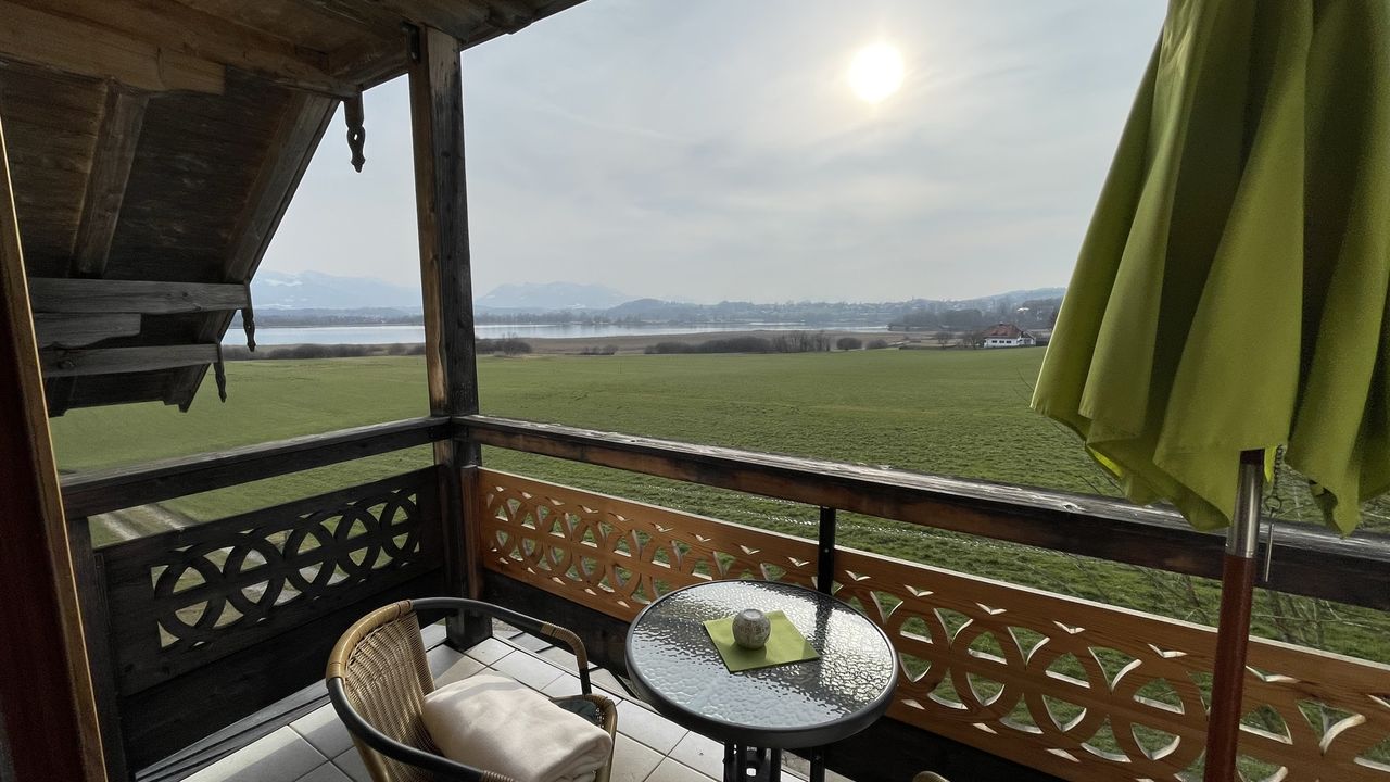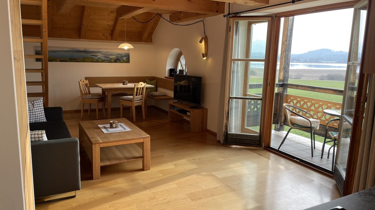 Die etwa 50 qm große Ferienwohnung ist durch eine Schlafgalerie räumlich getrennt und befindet sich im 2. Stock des SeeCafe Toni, ein einzelstehendes Landhaus am Nordufer des Chiemsees mit Blick über die Schafwaschener Bucht und die Chiemgauer Alpenkette.Beschreibung der Unterkunft