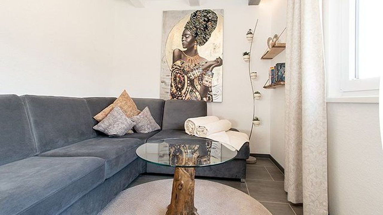 Das Wohnzimmer ist mit einer großzügigen, ausziehbaren Couch (mit vollwertiger Matratze) ausgestattet, so dass eine weitere Person Platz findet. Ein Flachbildfernseher und Internet sind ebenfalls vorhanden.