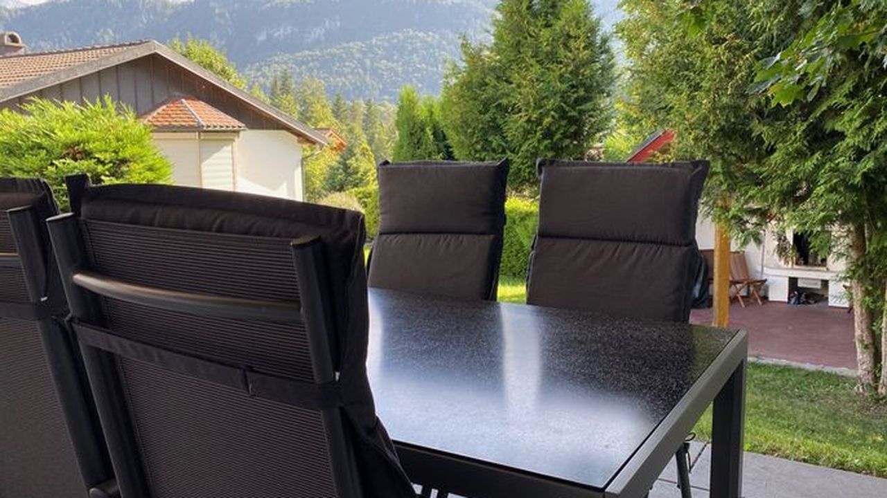 Die Terrasse weist nach Süden mit Blick auf die Berge und in den Garten. Genießen Sie bereits morgens zum Frühstück in einer geschützten Kaminecke die Sonne. Ideal um die Seele baumeln zu lassen.