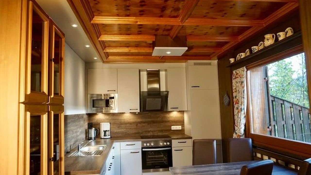 Die Wohnfläche des Hauses kommt so zu einem großen Teil dem großzügigen Wohnbereich mit Kachelofen, Essecke und offener Küche zu Gute. Im gesamten Wohnbereich entsteht durch die echte Zirbelholz-Kassettendecke eine sehr gemütliche Atmosphäre.