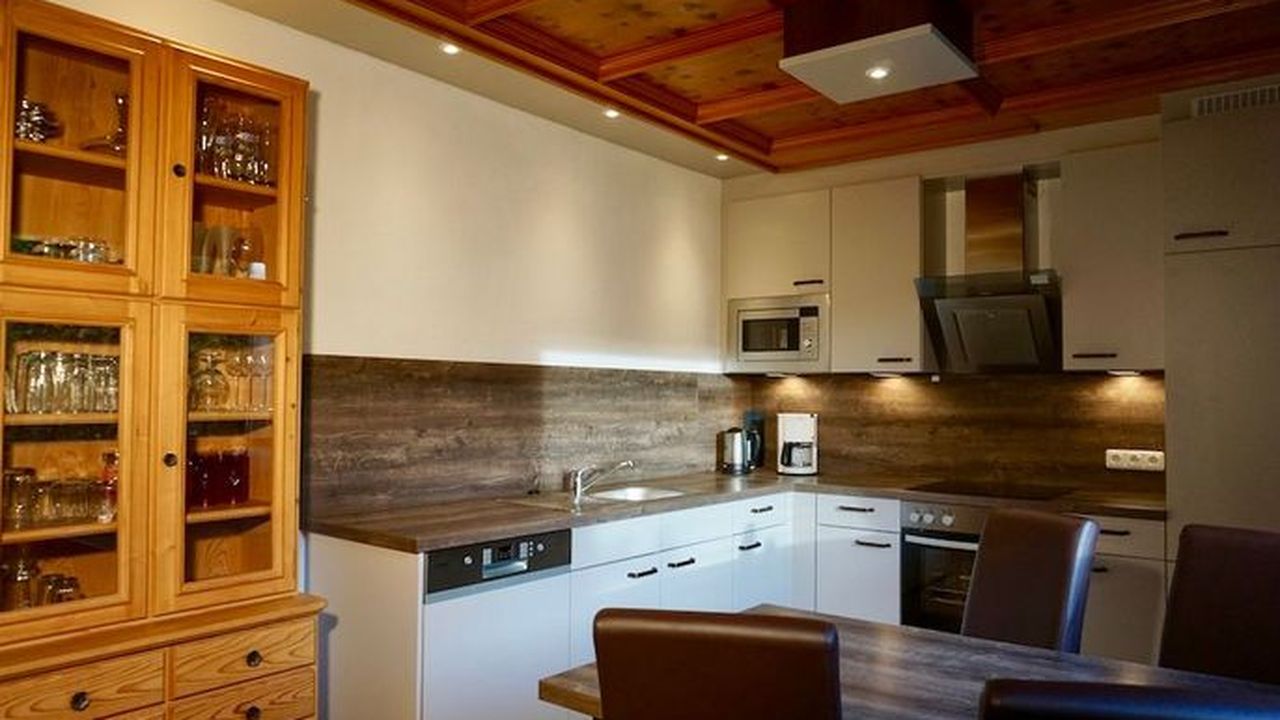 Die Küche ist ausgestattet mit einer Spülmaschine, einem Herd mit 4 Ceranfeld-Kochplatten und Backofen, einer Mikrowelle, einer Kaffeemaschine und einem Kühlschrank mit Gefrierfach.