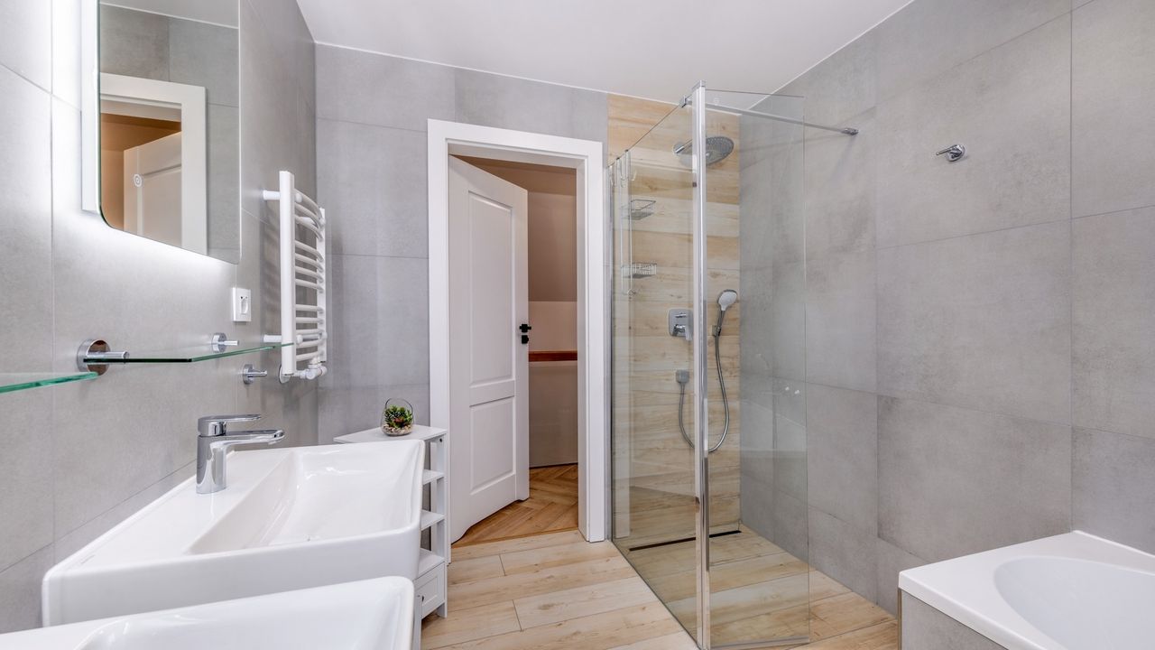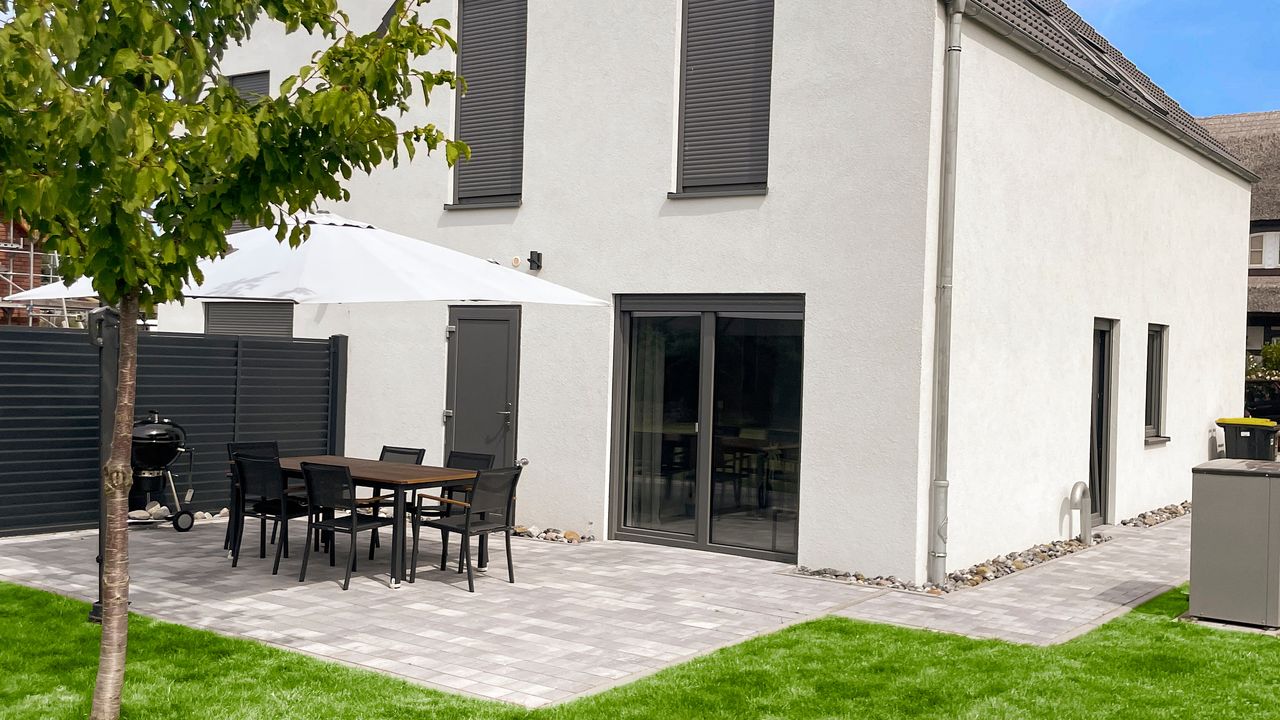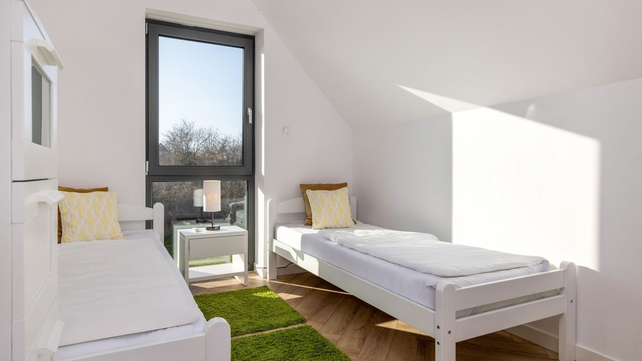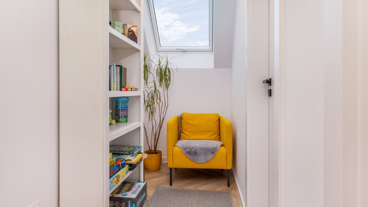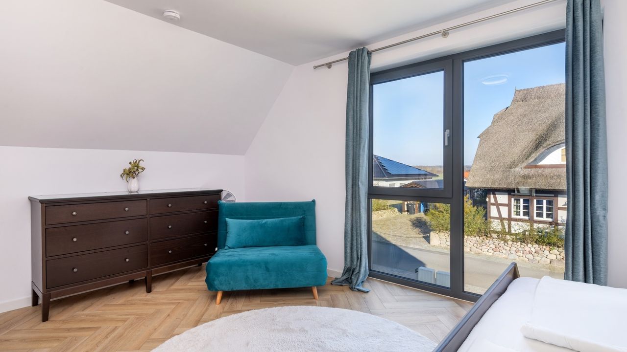 Im Obergeschoss befinden sich insgesamt drei Räume, die als Schlaf- und Aufenthaltsräume für Eltern und Kinder ausgestattet sind, sowie ein großes Badezimmer mit Wanne, ebenerdige Dusche, Doppelwaschtisch und WC.