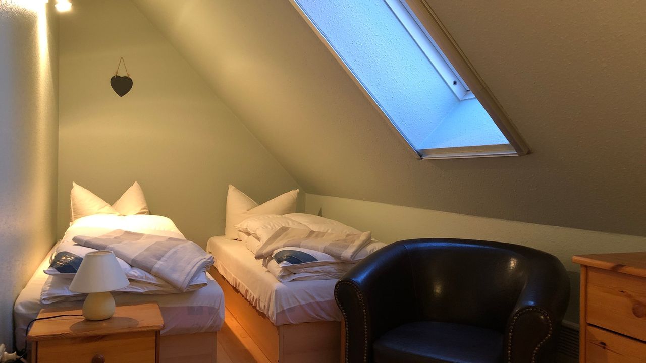 Im Obergeschoss befindet sich ein Schlafzimmer mit einem Doppelbett und ein offenes Schlafzimmer mit zwei Einzelbetten.