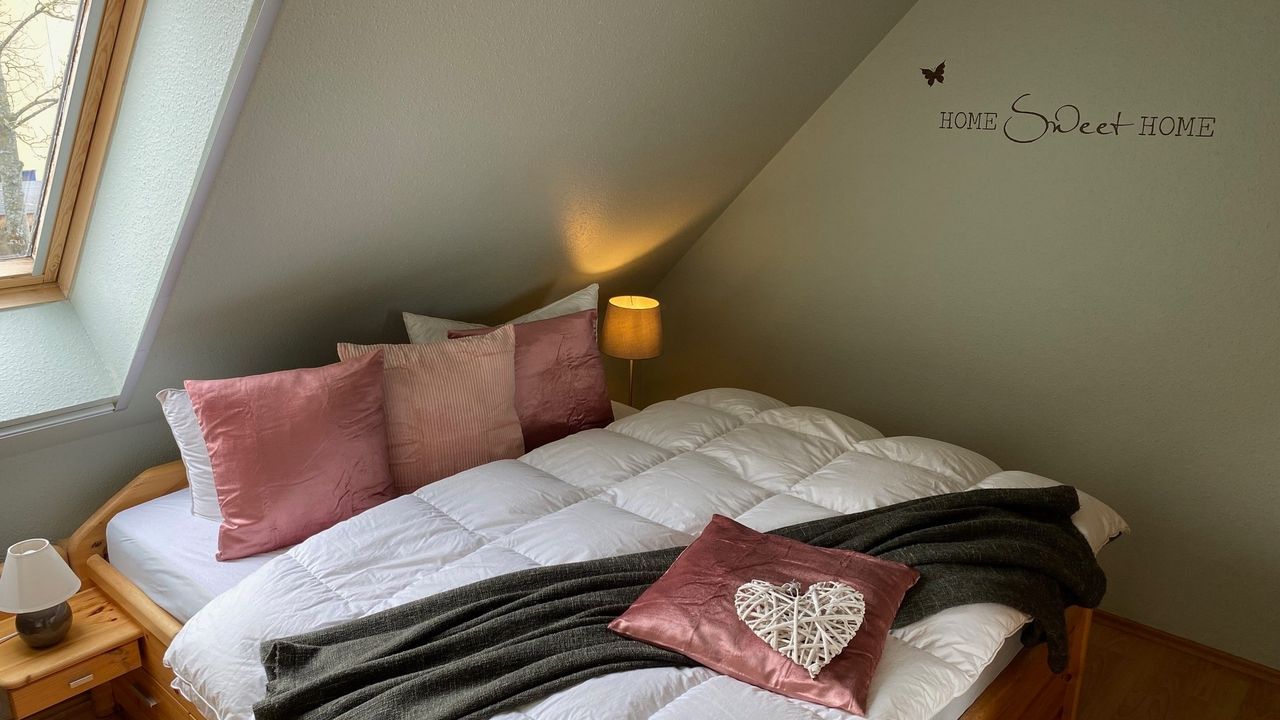 Im Obergeschoss befindet sich ein Schlafzimmer mit einem Doppelbett und ein offenes Schlafzimmer mit zwei Einzelbetten.