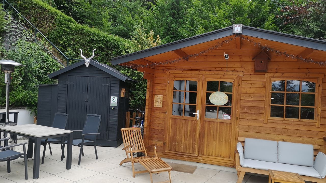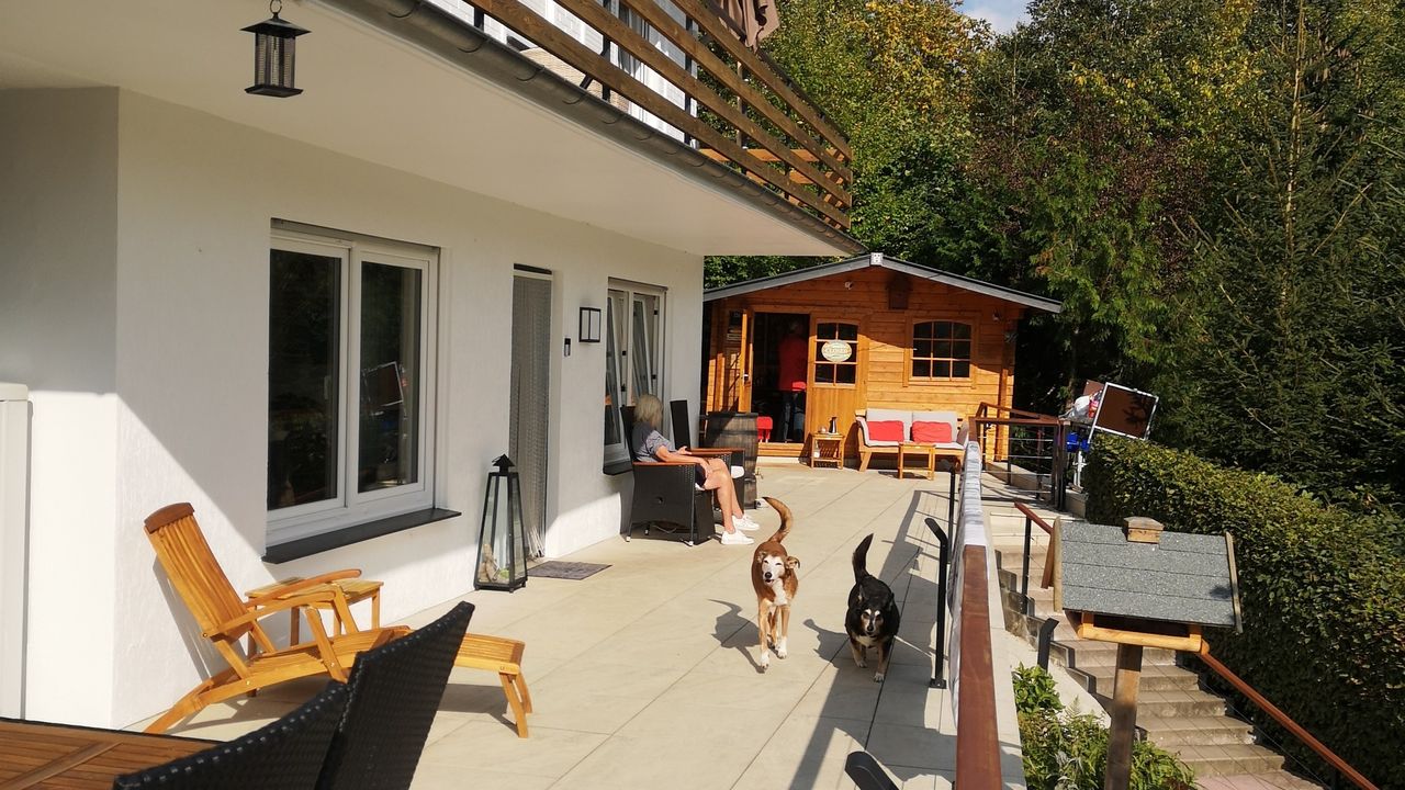 Die große Sonnenterrasse lädt zum Verweilen ein. Sie verfügt über zwei getrennte Grillecken, so dass jede Wohnung über eigene, gemütliche Gartenmöbel verfügt. Je ein Tisch mit sechs Stühlen und Stuhlauflagen, Sonnenschirm und Grill bzw. Grillkamin steht zur Verfügung. Genießen Sie gemütliche Grillabende oder einfach ein Glas Wein in traumhaftem Ambiente. Bei Sonnenschein lässt sich herrlich auf einer unserer bequemen Sonnenliegen entspannten. Eine Tasse Kaffee am Nachmittag vor unserer rustikalen Almhütte und die Seele baumeln lassen. Was will man mehr.