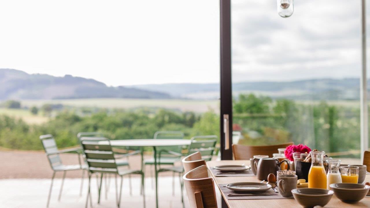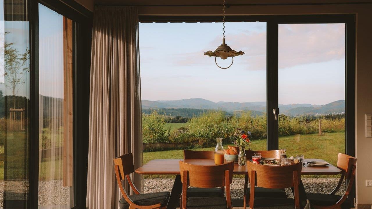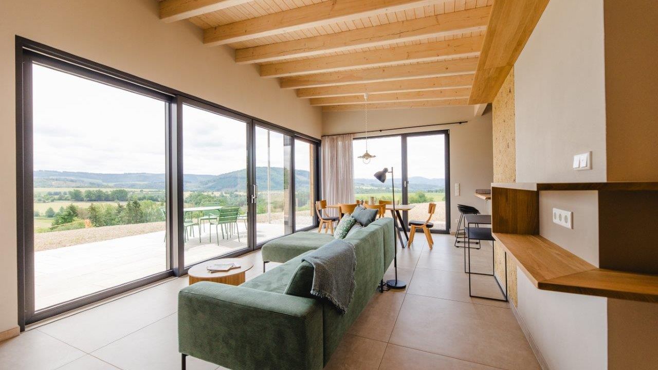 Bodentiefe Fenster zu zwei Seiten bieten einen unverbauten, weiten Blick in die Natur.