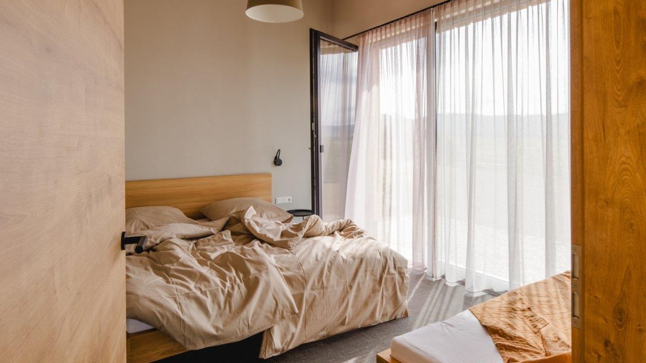 Ebenerdig auf 110qm verteilt befinden sich zwei Schlafzimmer mit Doppelbetten und gemütlicher Kinderkoje. Platz für ein Babybett gibt es außerdem. Bodentiefe Fenster in einem der Schlafzimmer sorgen für einen fantastischen Blick auf tolle Sonnenaufgänge über den Sauerländer Bergen. Eine tiefe Fensterbank mit Blick zum Stall und in den Garten sorgt im zweiten Schlafzimmer für gemütliche Stunden.